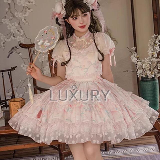 華ロリ 中華ロリ ワンピース のみ パステルカラー 膝上 半袖 立ち襟 シフォン 中国風 チャイナ 妖精 かわいい スウィート 春夏コーデ 撮影用 イベント