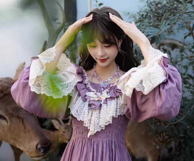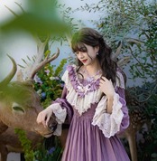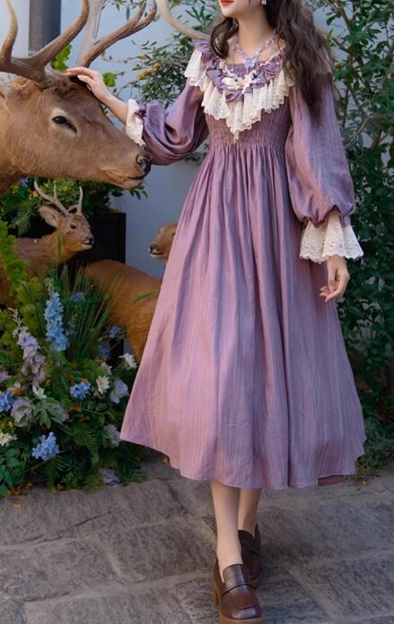 【納期1ヶ月】セミロリータ ロングワンピース のみ Aライン フリル ランタン袖 Aライン フレンチクラシカル お嬢様 春秋コーデ お茶会