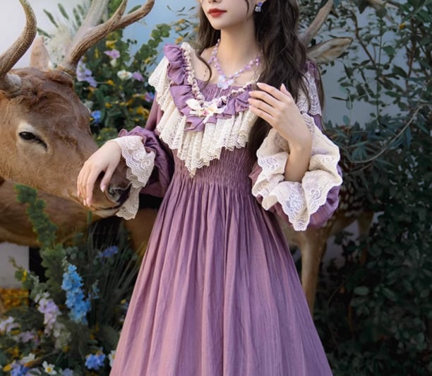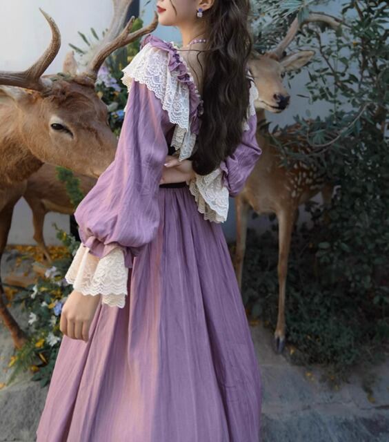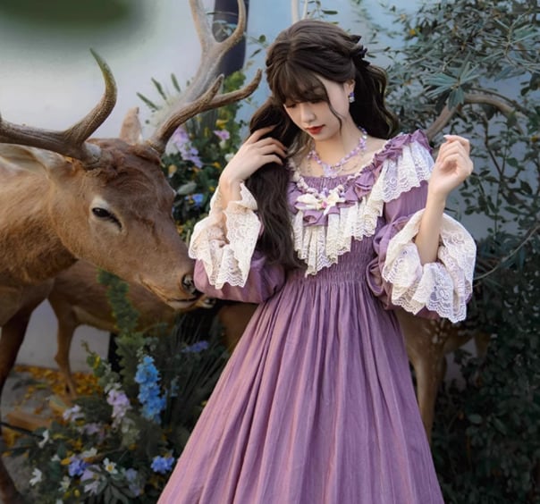 セミロリータ ロングワンピース のみ Aライン フリル ランタン袖 Aライン フレンチクラシカル お嬢様 春秋コーデ お茶会