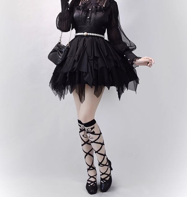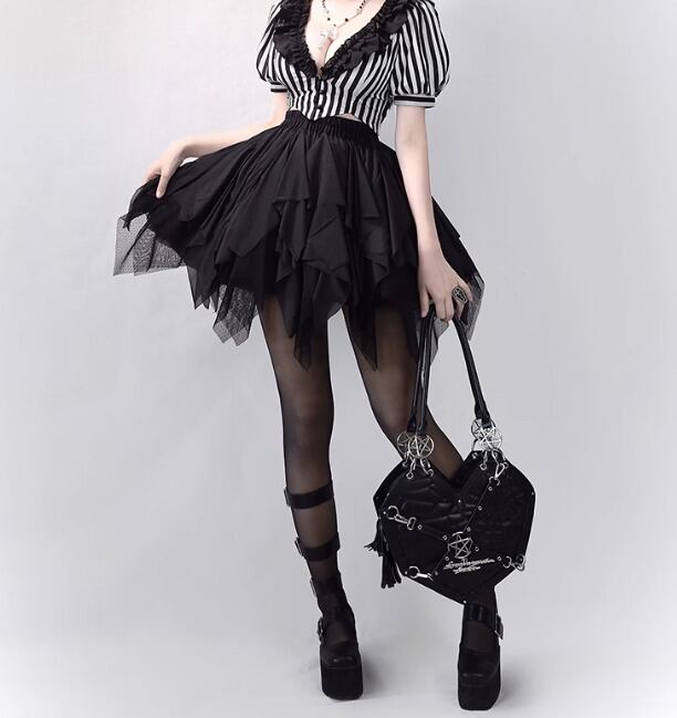 こちらのスカートは、ミニ丈のアシンメトリーデザインで、妖精のような幻想的かつゴシックな雰囲気を演出します!