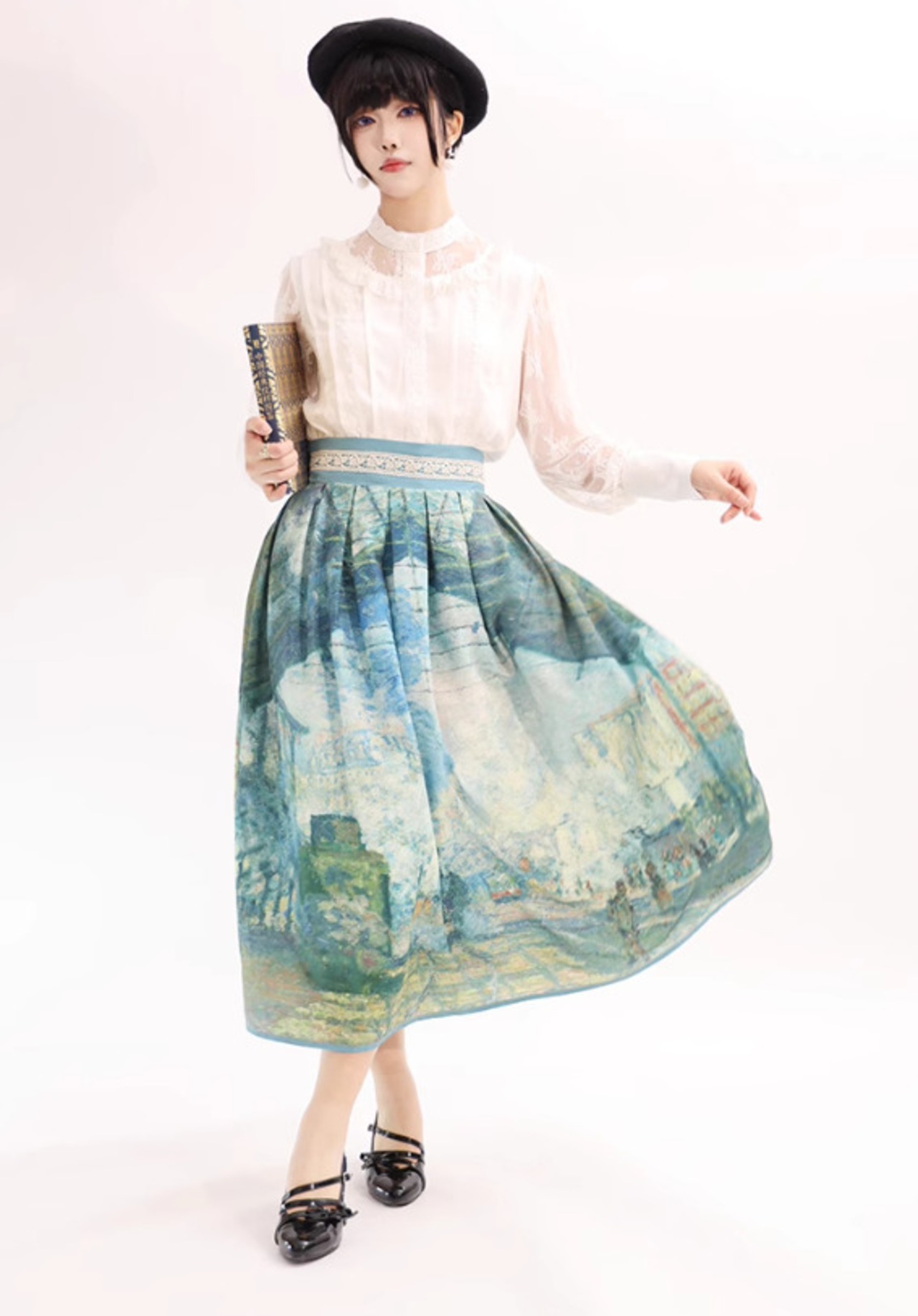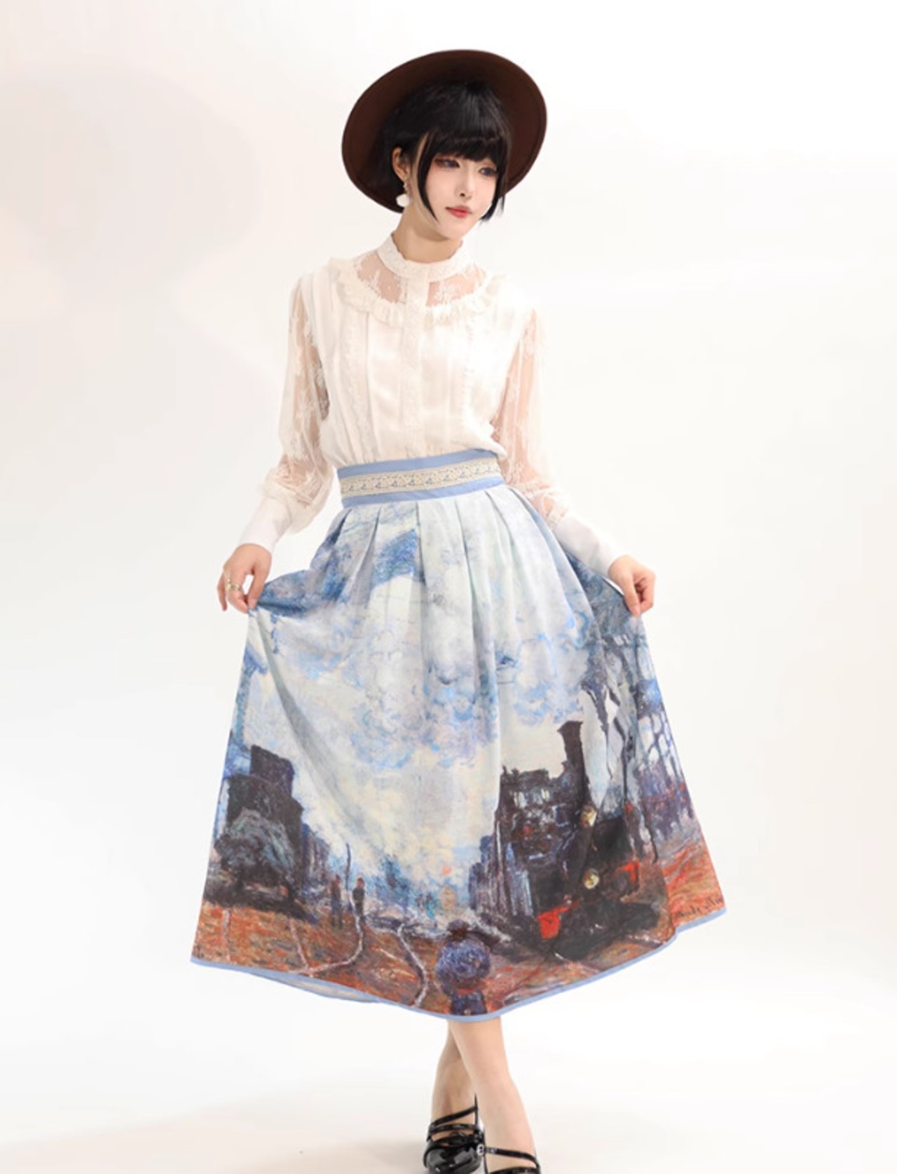 【納期60日】クラシカルロリータ クラロリ スカート のみ 油画プリント ひざ下丈 ミモレ丈 レトロ エレガント 英国スタイル お嬢様 上品 優雅 お茶会 イベント