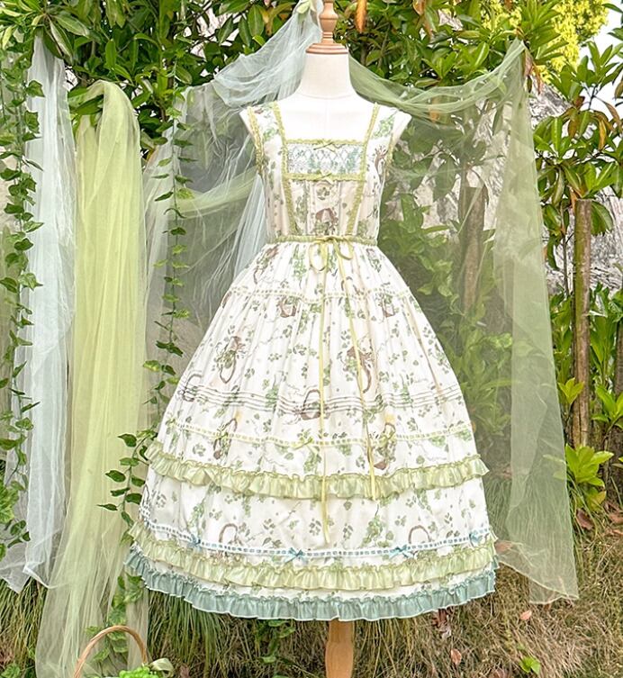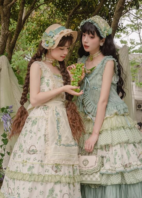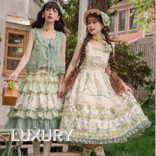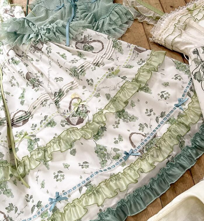 ロリータファッション ジャンパースカート のみ フリル ひざ下丈 ミモレ丈 フルーツ ぶどう スクエアネック レトロ 森ガール お嬢様 ガーリー 上品 夏コーデ お茶会 パーティー
