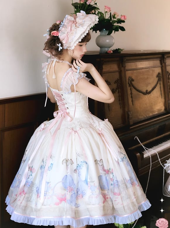 ノースリーブのデザインとスクエアネックが、お嬢様スタイルを完璧に演出し、特別なイベントやお茶会にぴったりです。