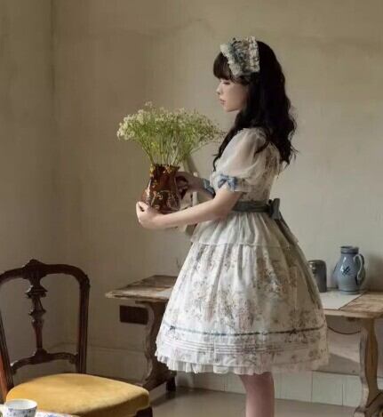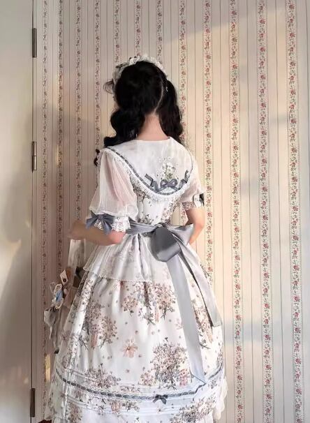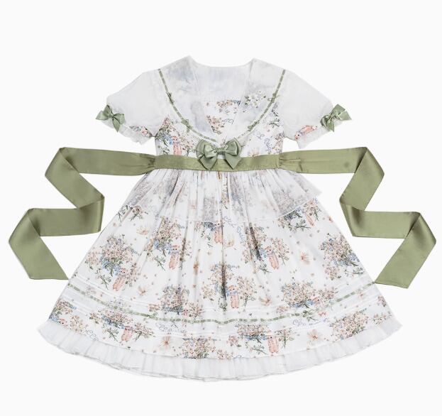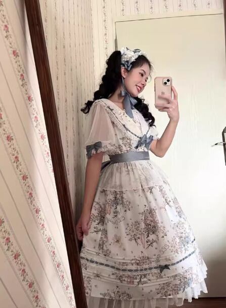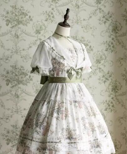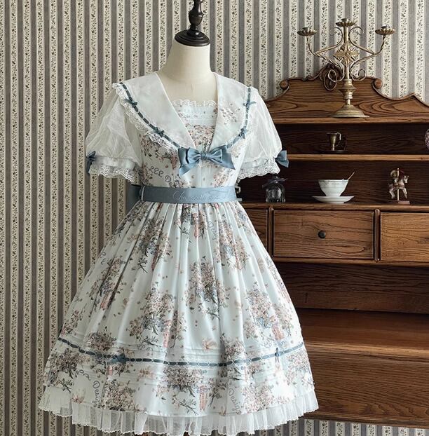 ロリータファッション 甘ロリ ワンピース のみ 2色 2タイプ チュール 花柄 お花 半袖 りぼん フリル 膝丈 ひざ丈 ミディアム Aライン レトロ ナチュラル ガーリー 夏コーデ デイリー