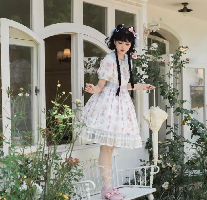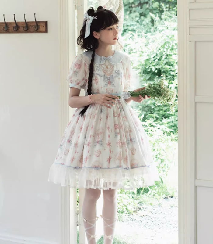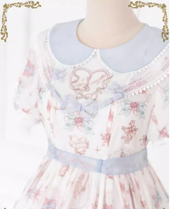 ロリータファッション 甘ロリ ワンピース 半袖 プリント りぼん フリル ミニ丈 ショート丈 お嬢様 ナチュラル ガーリー 夏コーデ お散歩 デイリー