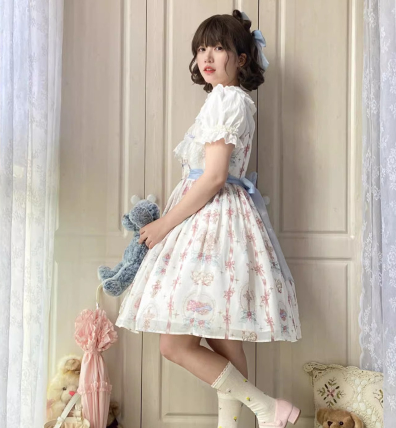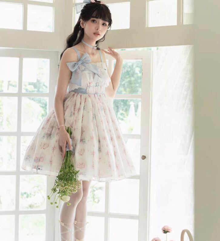 ロリータファッション 甘ロリ ジャンパースカート プリント りぼん フリル ミニ丈 ショート丈 膝上 お嬢様 ナチュラル ガーリー 夏コーデ お散歩 デイリー