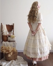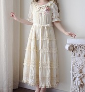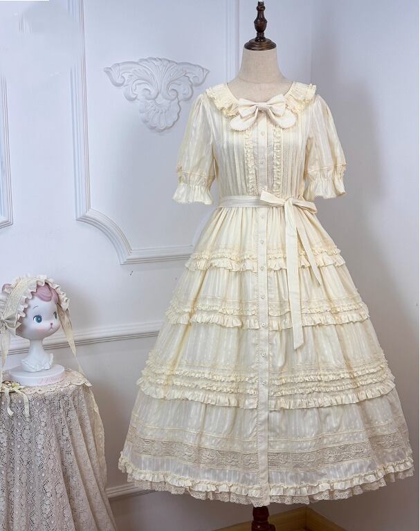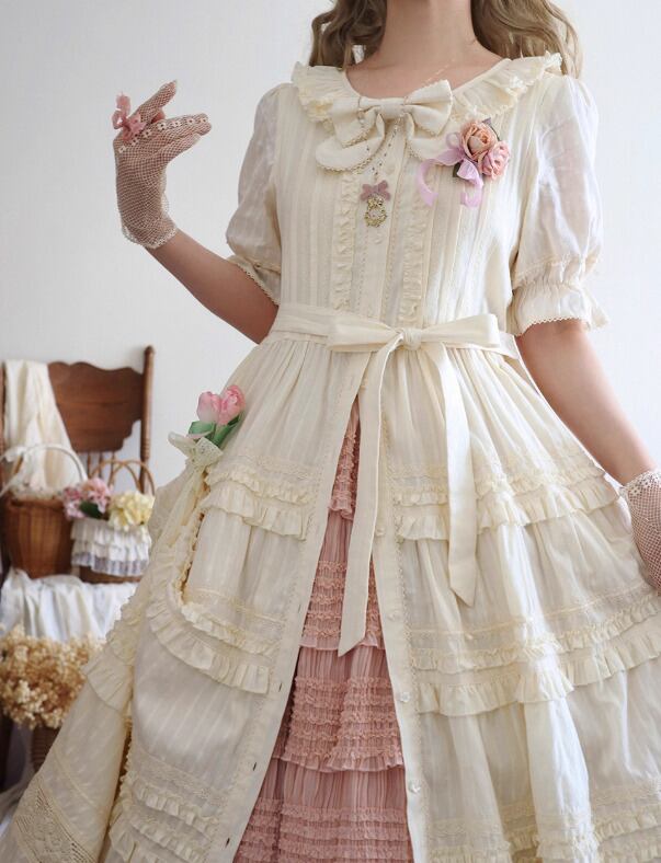 ロリータファッション ワンピース +細ベルトのみ フリル ロング丈 半袖 お嬢様 レトロ 古風 ゴージャス スウィート 春夏コーデ お茶会 イベント
