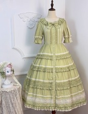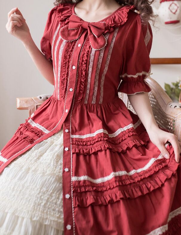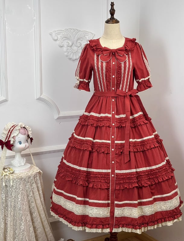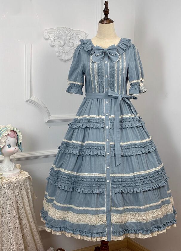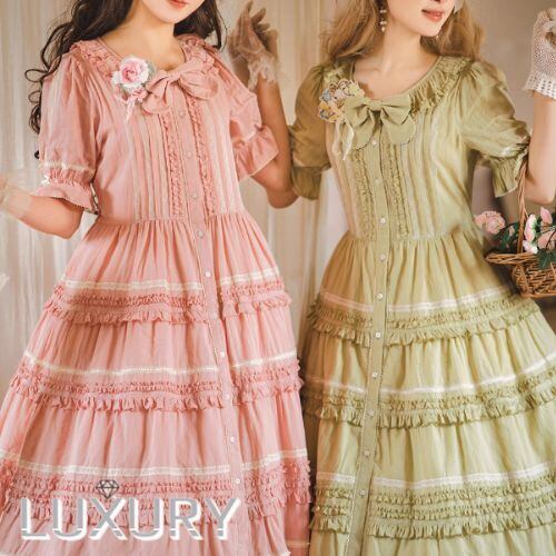 【納期40日】ロリータファッション ワンピース +細ベルトのみ 5色 フリル ロング丈 半袖 お嬢様 レトロ 古風 ゴージャス スウィート 春夏コーデ お茶会 イベント