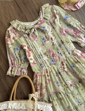 このワンピースは、愛らしい花柄とフリルデザインが特徴で、どこかノスタルジックな雰囲気を醸し出しています。
