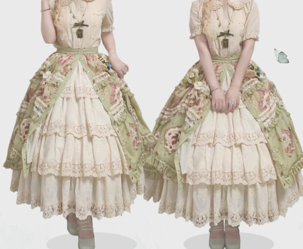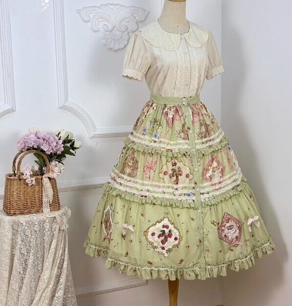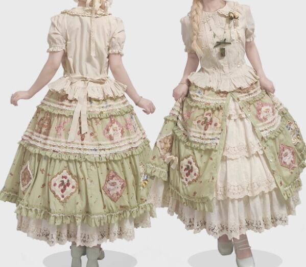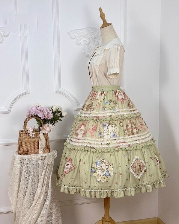 【納期40日】ロリータファッション スカート のみ 花柄 お花 アップリケ フリル ロング丈 お嬢様 森ガール カジュアル ガーリー スウィート 春夏コーデ お茶会 お散歩 イベント
