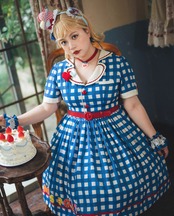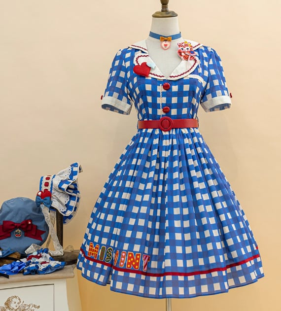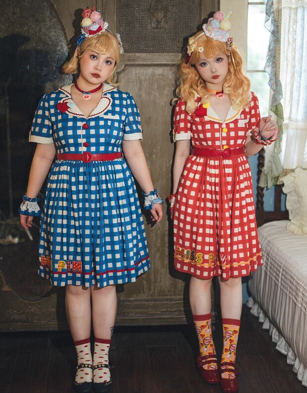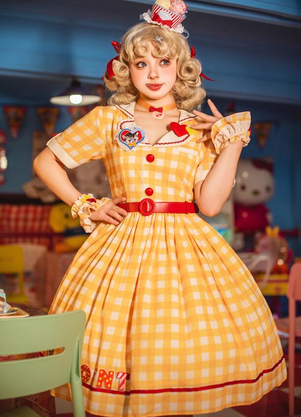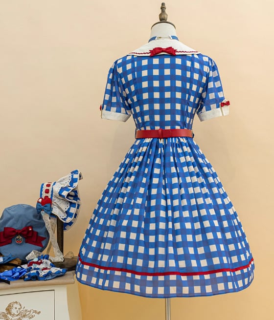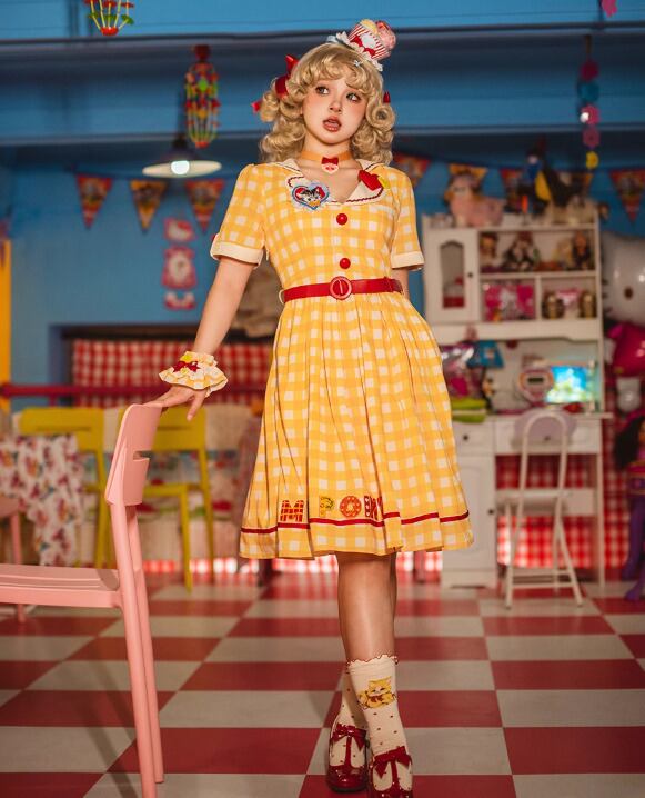 【納期40日】ロリータファッション ワンピース +ウエストベルト付き 3色 チェック柄 膝丈 ひざ丈 ミディアム 半袖 アメリカンダイナー風 ガーリー 夏コーデ イベント