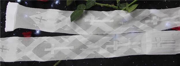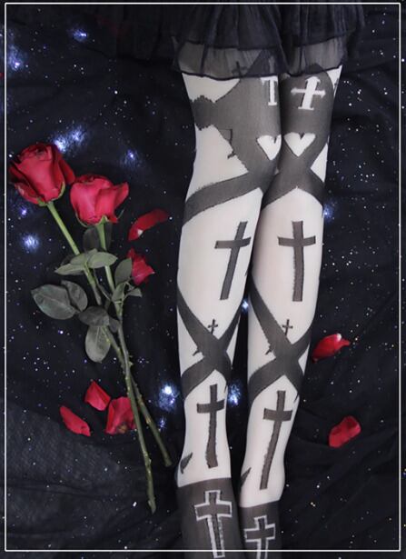 こちらのタイツは、シースルー素材と美しい十字架デザインが特徴で、暗黒系の魔法使いのスタイルを演出します。