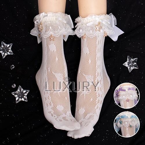 こちらの靴下は、柔らかい涼し気な素材とレースをあしらったデザインが特徴で、マーメイドや貝殻モチーフがファンタジックな印象を演出します。