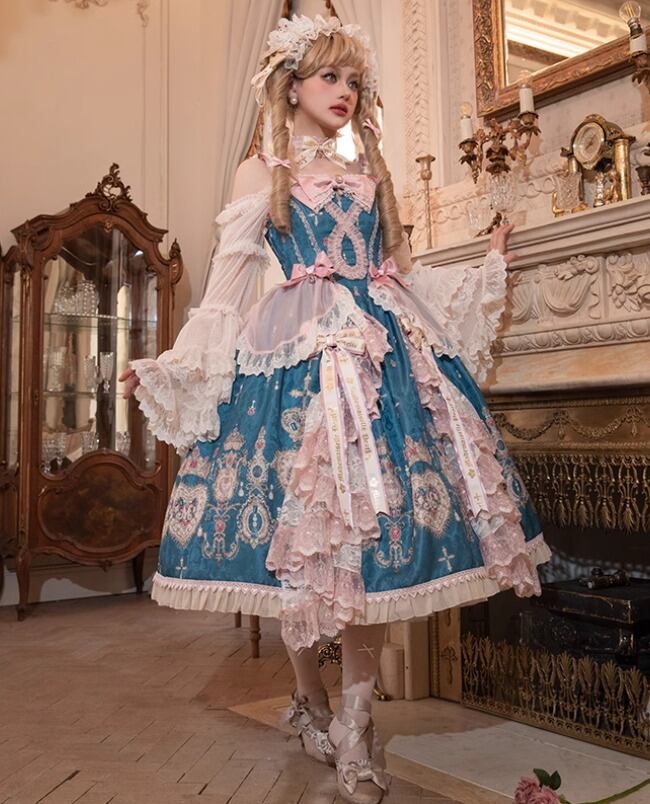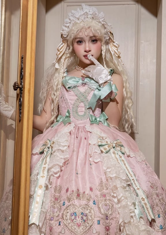 こちらのジャンパースカートは、美しいレースやリボンがふんだんにあしらわれており、