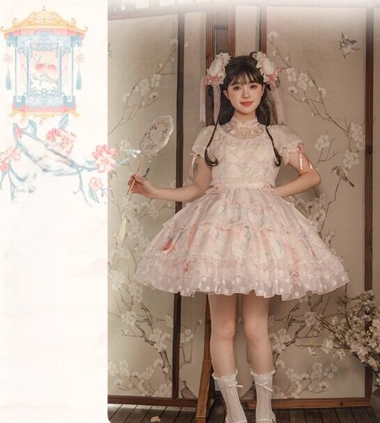 華ロリ 中華ロリ ワンピース のみ 花柄 ミニ丈 ショート丈 膝上 半袖 立ち襟 ハイネック シフォン アジアン 中国風 チャイナ フェミニン 夏コーデ 撮影用 イベント