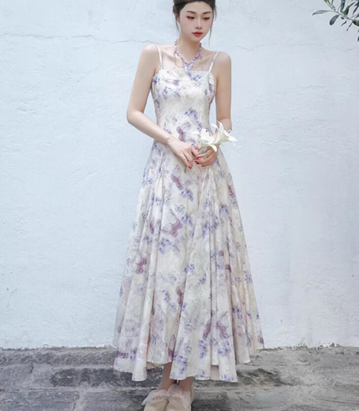 セミロリータ ワンピース のみ バタフライ 蝶々 ロング丈 Aライン フレア ノースリーブ キャミソール 中国風 チャイナ  エレガント 春夏コーデ お茶会 デート