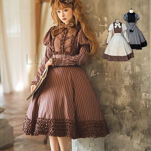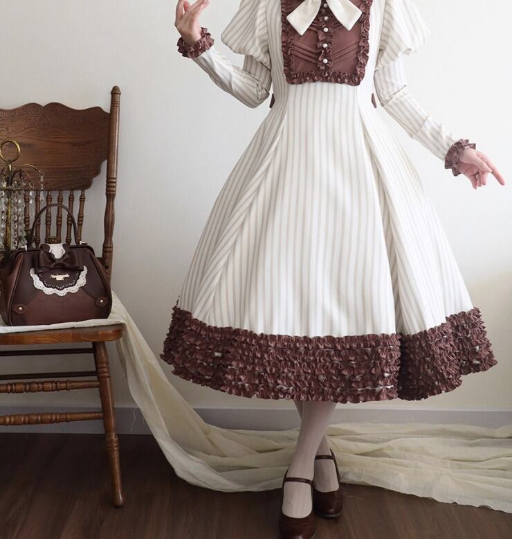 【納期40日】クラロリ ワンピース +リボンブローチ のみ チョコレート 長袖 ひざ下丈 ミモレ丈 レトロ スウィート 優雅 秋冬コーデ お茶会 デイリー