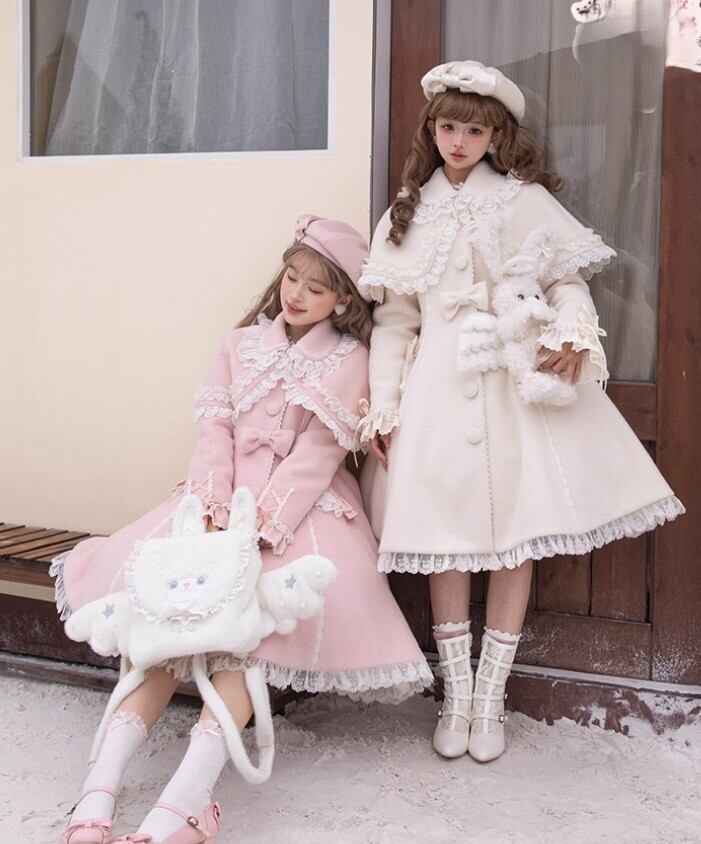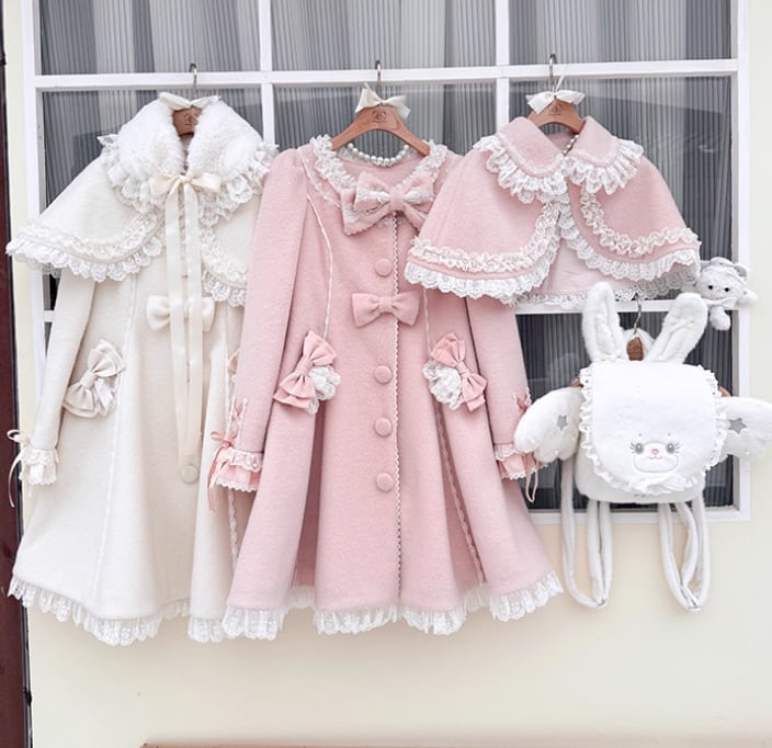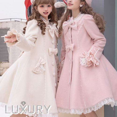 こちらのロングコートは、冬の寒さを華やかに彩るリボンやレースをあしらったデザインで、お嬢様のような可愛らしさを引き立てます。