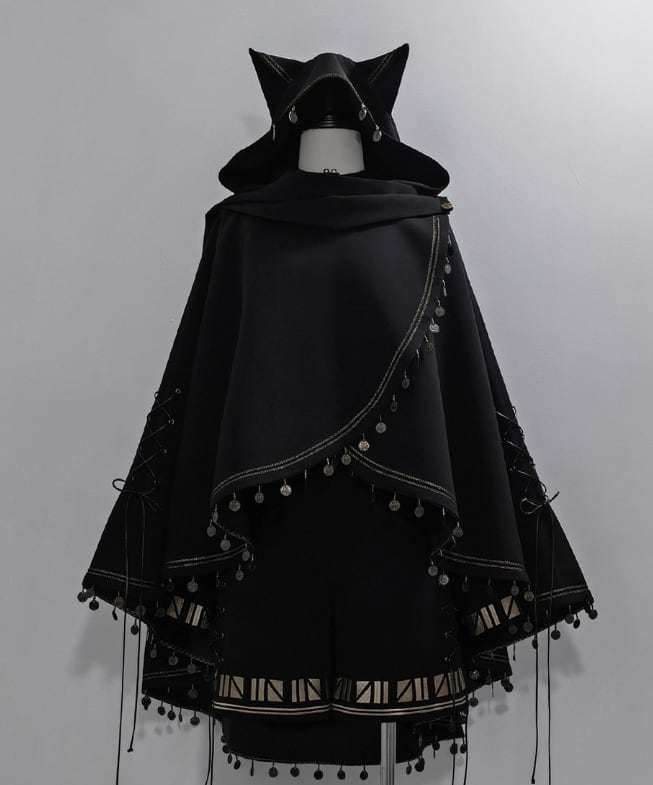 こちらのケープ マントは、黒猫のデザインと童話を思わせるビッグシルエットが特徴で、ユニセックスに着用できるアイテムです。