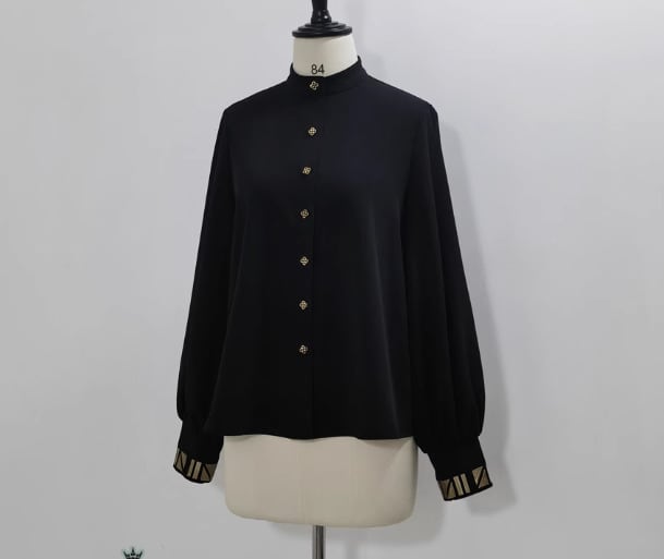 こちらのブラウスは、黒猫のデザインと童話を思わせる独特のスタイルが特徴で、レトロ感あふれる立ち襟とハイネックが魅力的なアイテムです。