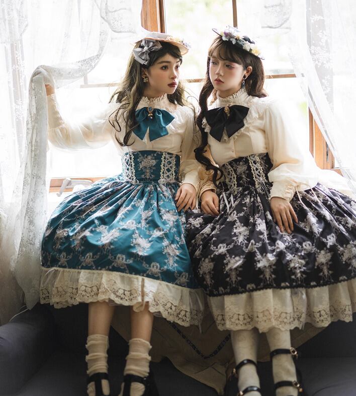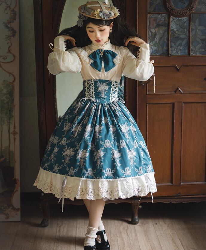 【納期40日】クラシカルロリータ クラロリ スカート のみ コルセット風 膝丈 ミディアム ヴィンテージ アンティーク レトロ 古風 ガーリー 優雅 春秋コーデ お茶会 撮影用