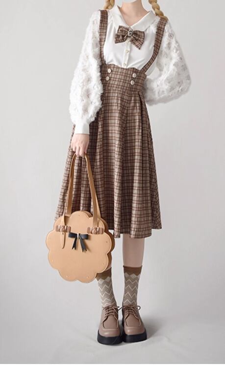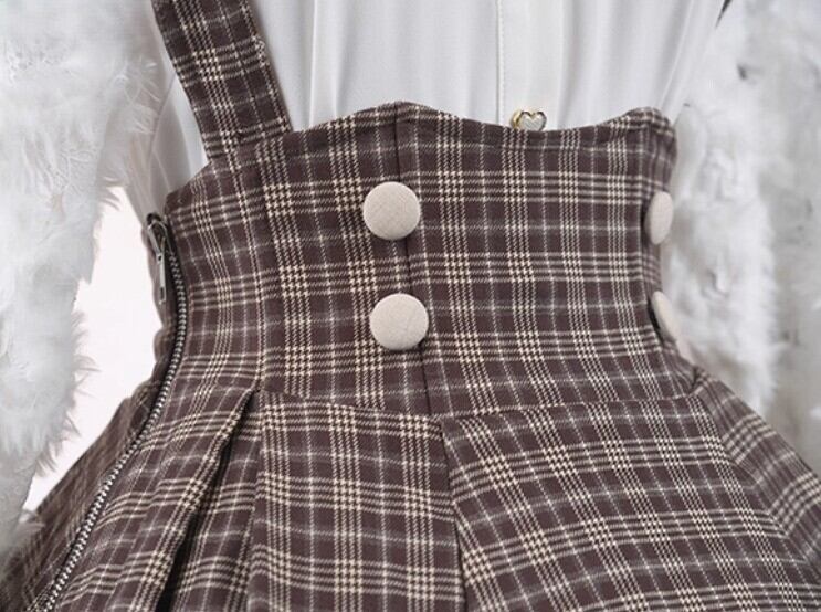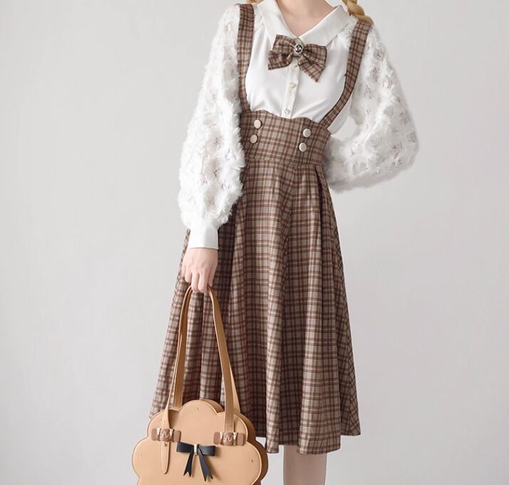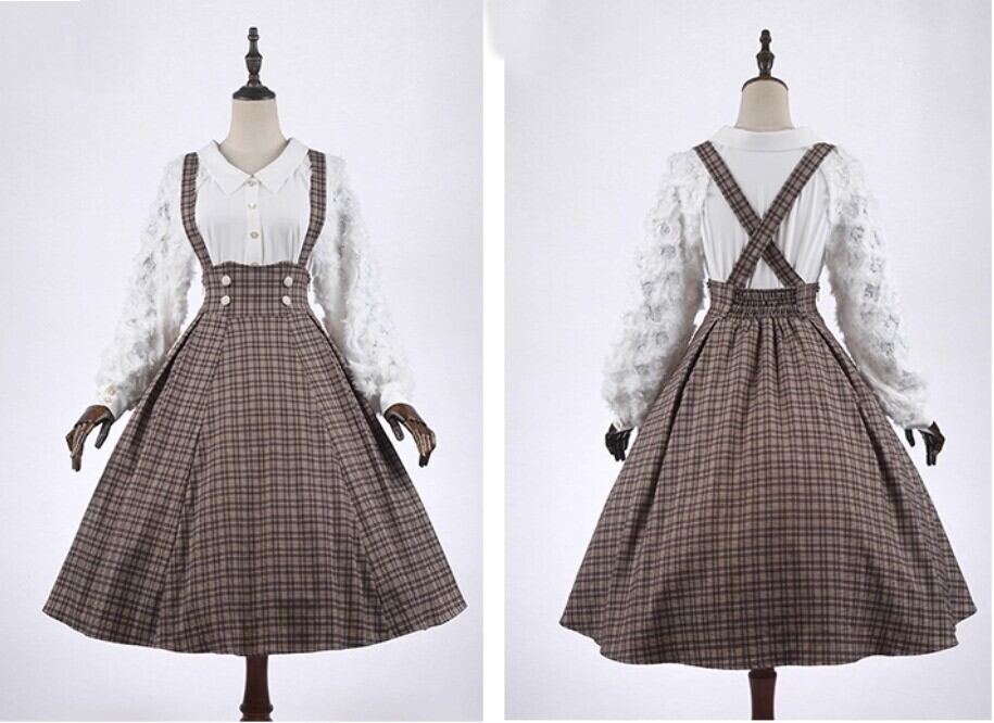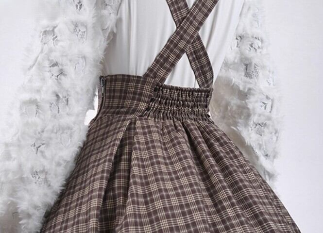 セミロリータ スカート +サスペンダー付き のみ チェック柄 ひざ丈 文学少女 フレンチクラシカル レトロ 古風 ガーリー フェミニン 清楚 春秋コーデ お茶会 デイリー デート