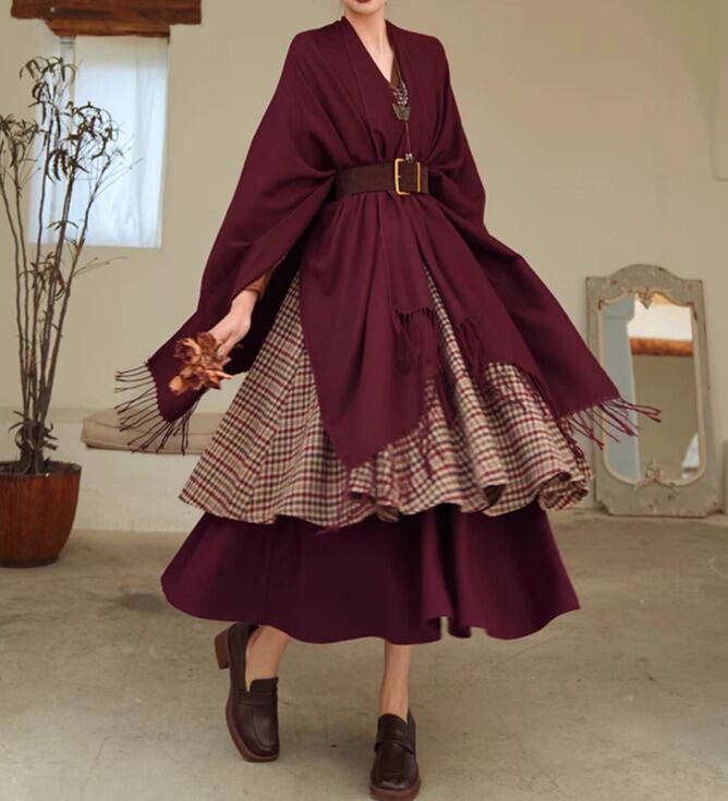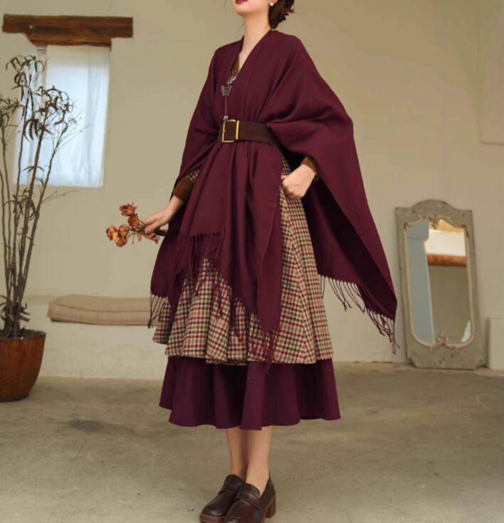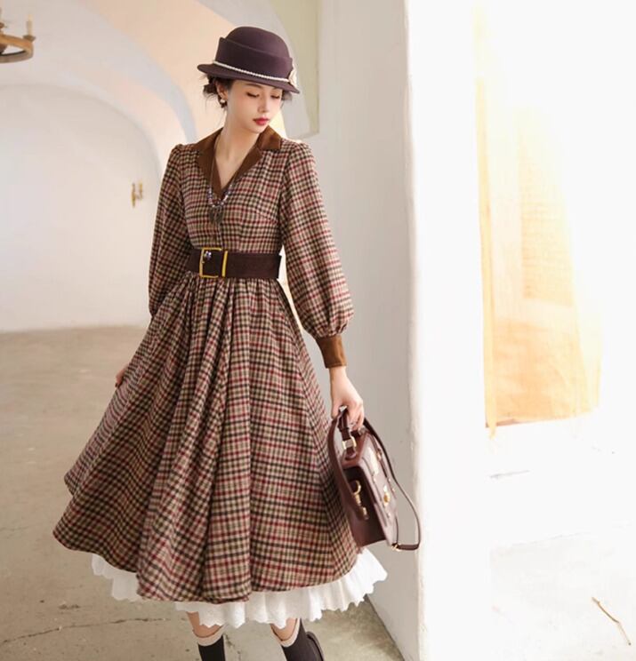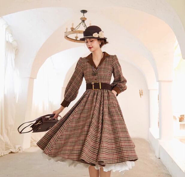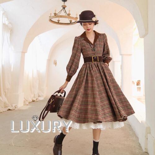 【納期40日】セミロリータ ワンピース のみ チェック柄 フレア ミモレ丈 レトロ フレンチクラシカル 清楚 フェミニン 大人可愛い 秋冬コーデ お茶会 デート デイリー