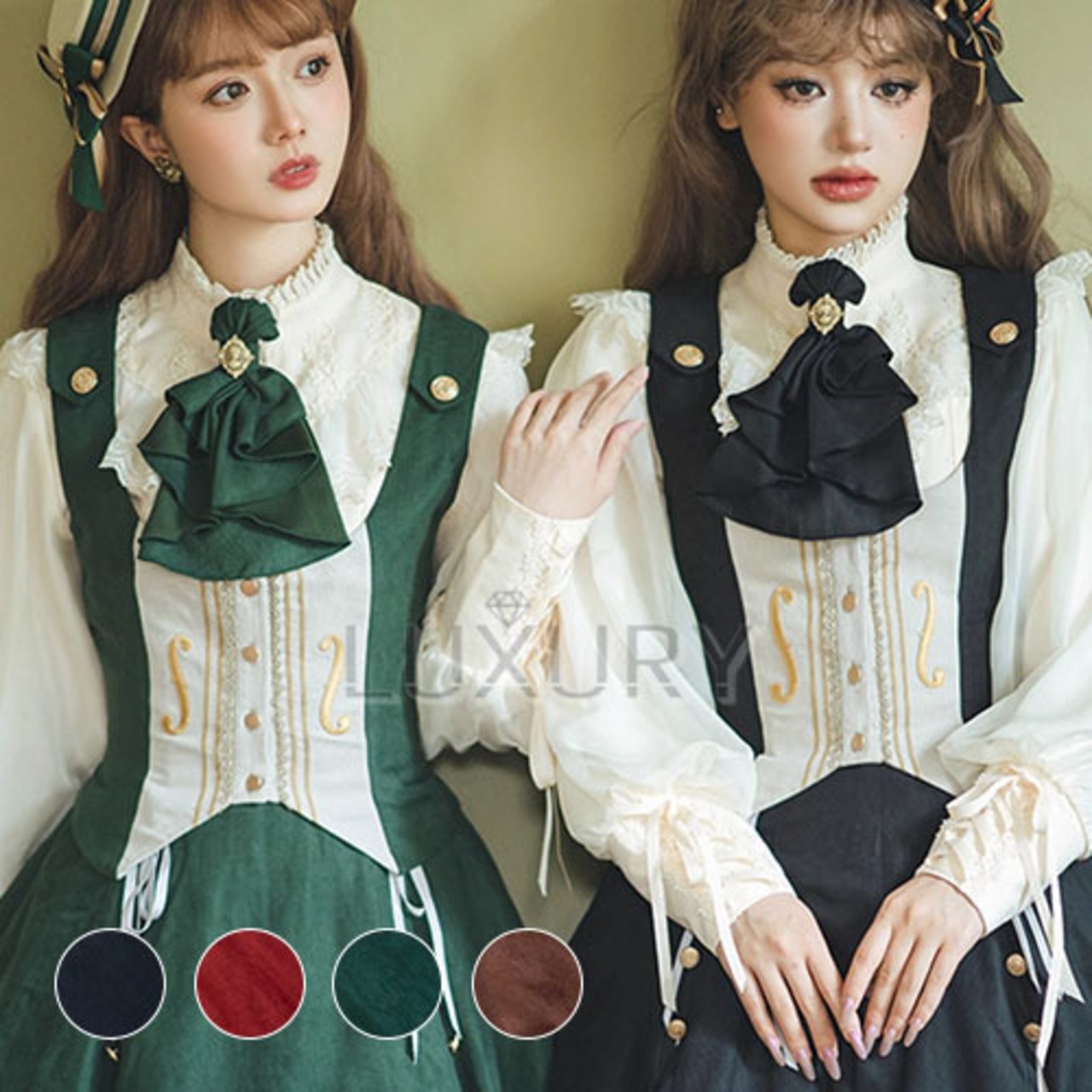 上品なコーデュロイ素材を使用したこのベストは、制服風のデザインが魅力的。エレガントなシルエットが一層際立ち、特別なお茶会やイベントに最適です。