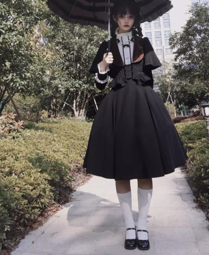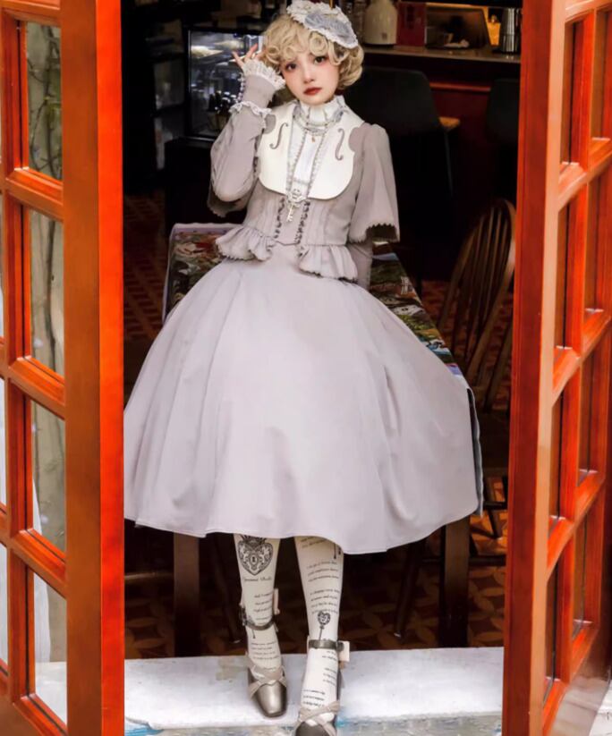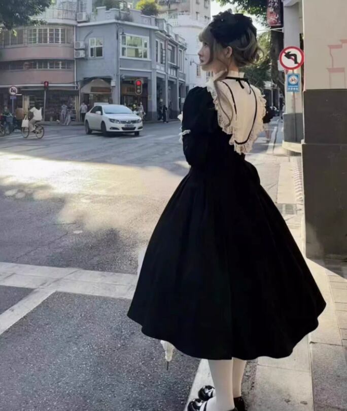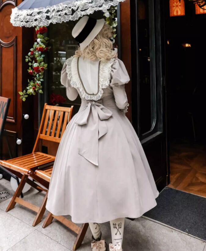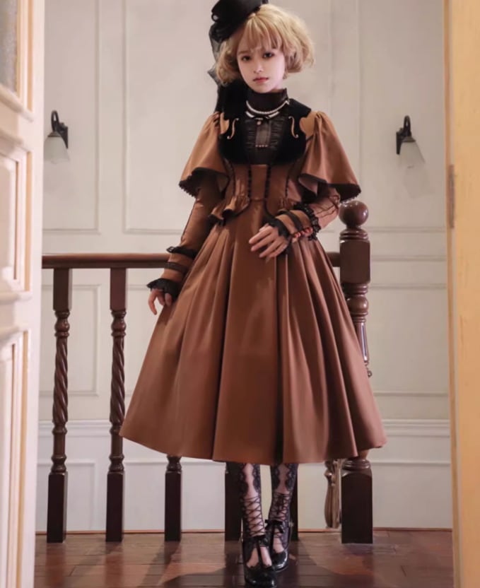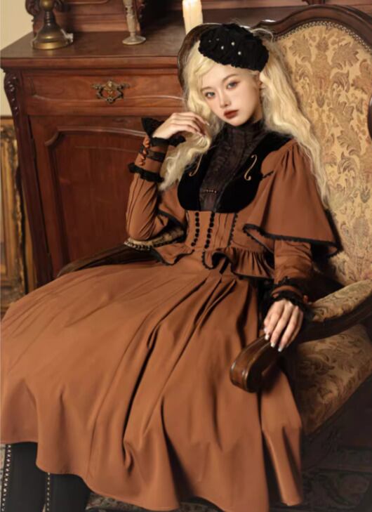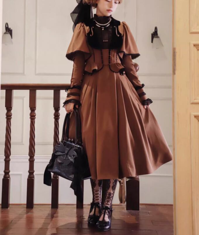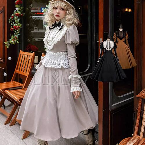 クラシカルロリータ クラロリ ワンピース のみ 膝丈 ひざ丈 ミディアム 長袖 立ち襟 ハイネック アンティーク 文学少女 ガーリー 秋冬コーデ お茶会 イベント デート