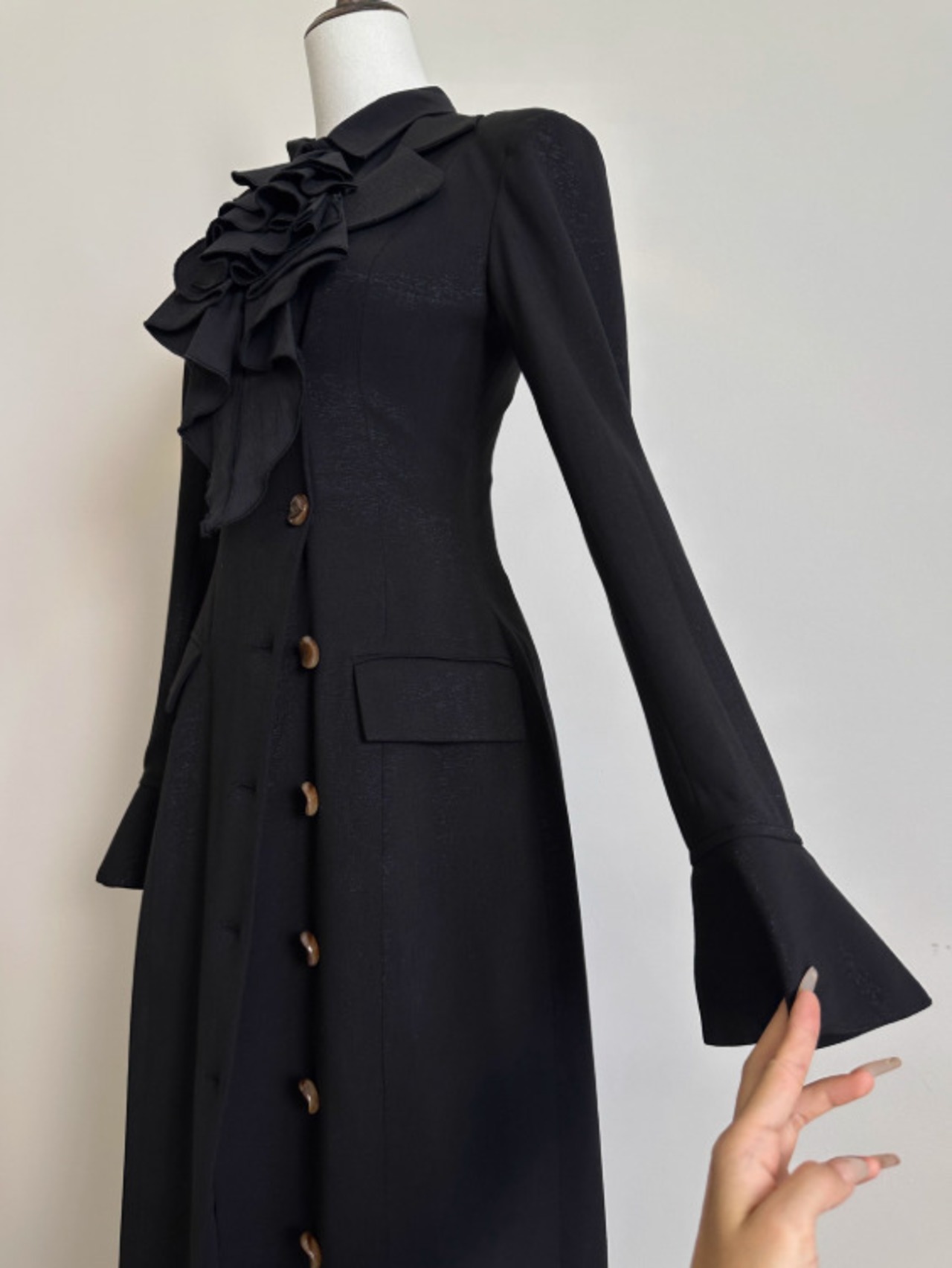 上品なブラックカラーは、秋冬のコーディネートにぴったりで、お茶会やデートシーンでも自信を持って着こなせる一着です。