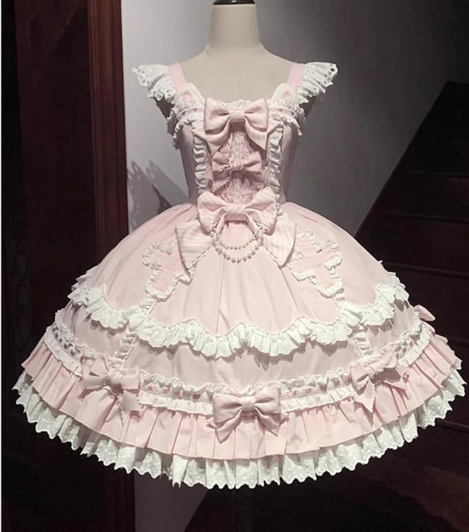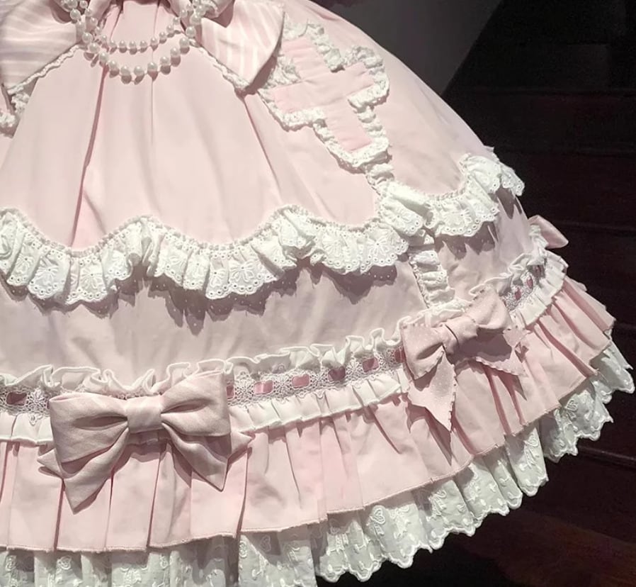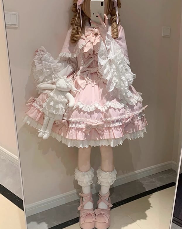 甘ロリータ ジャンパースカート ケープ リボン 3点セット フリル ひざ丈 ミディアム お嬢様 童話風 ゆめかわ ゆるふわ ラブリー メルヘン ゴージャス ガーリー レディースファッション 撮影