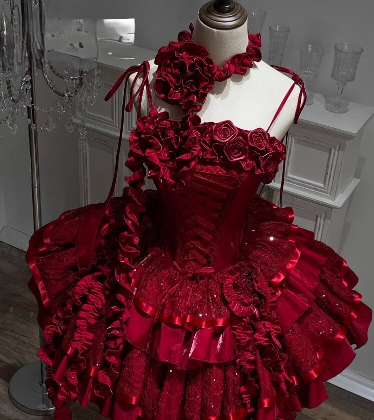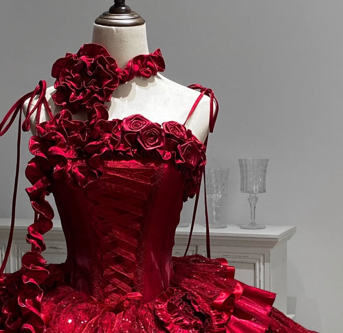 華やかな薔薇のモチーフがあしらわれ、貴婦人や貴族を彷彿とさせるスタイルで、特別なイベントや舞台での存在感を引き立てます。