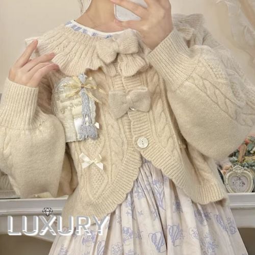 このカーディガンは、可愛らしいリボンデザインが特徴で、お嬢様スタイルを引き立てます!
