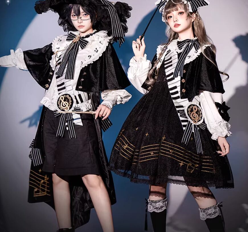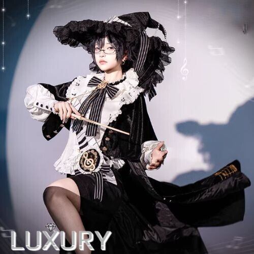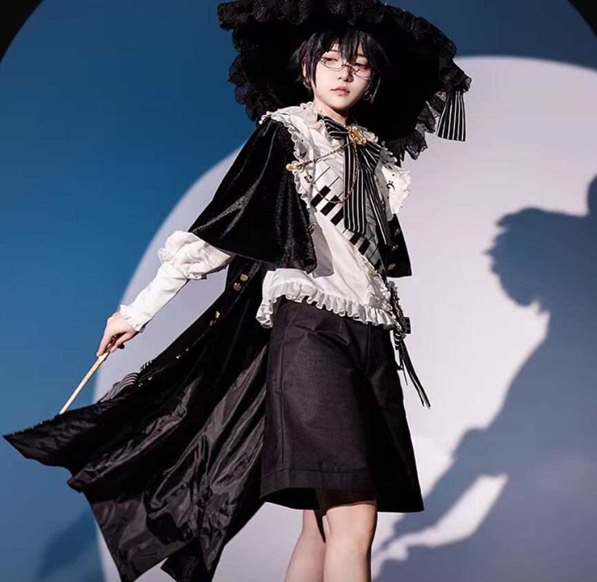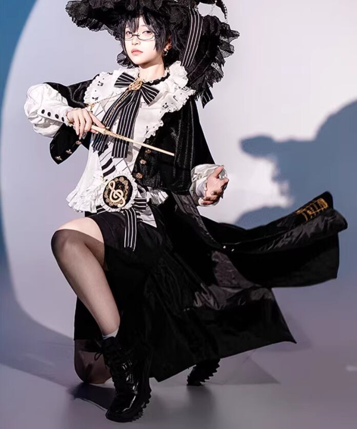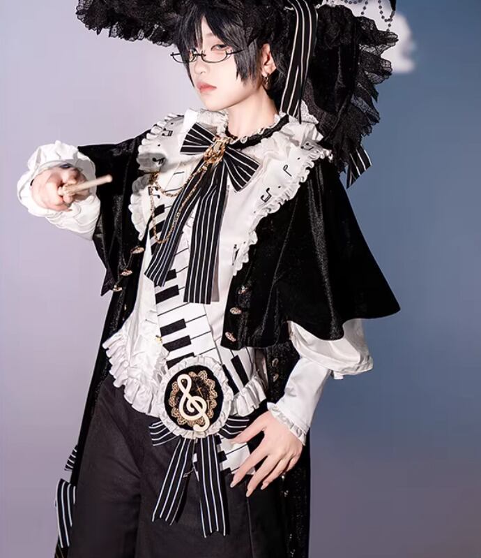 男装 皇子 ロングマントベスト + ブラウス + パンツ + サッシュベルト + 徽章 + ブローチ 6点セット 音符 ゴシック 魔法使い モノトーン パンク クール 舞台 撮影用