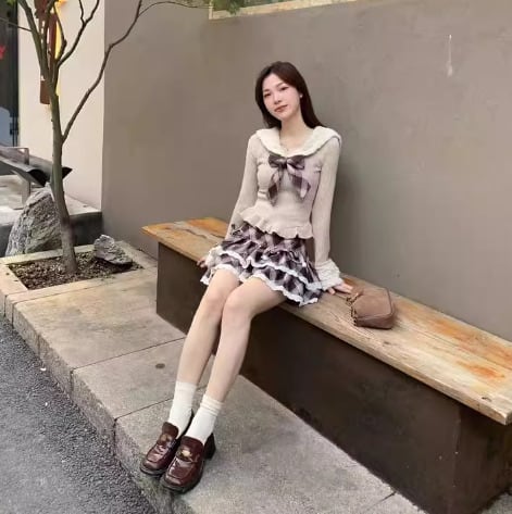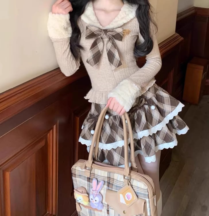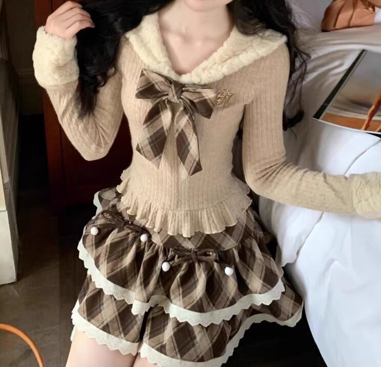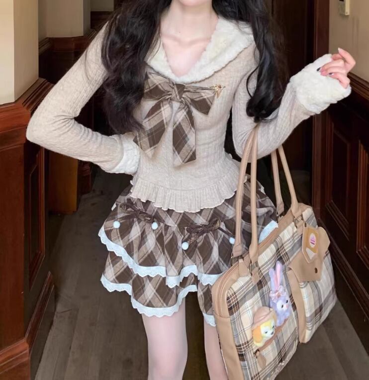 甘ロリ セミロリータ スカート + トップス セットアップ チェック柄 りぼん セーラーカラー ミニ丈 レトロ 古風 お嬢様 かわいい ガーリー 秋冬コーデ バレンタイン デート