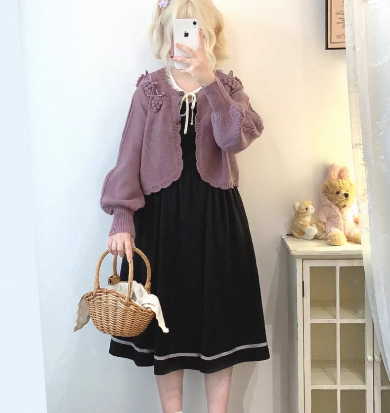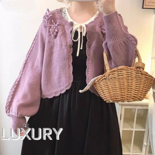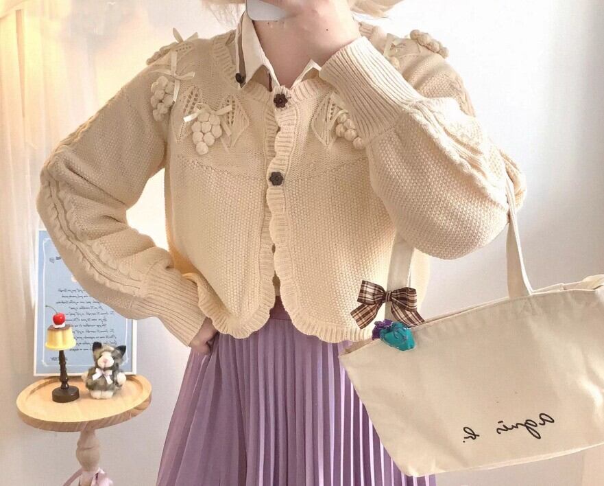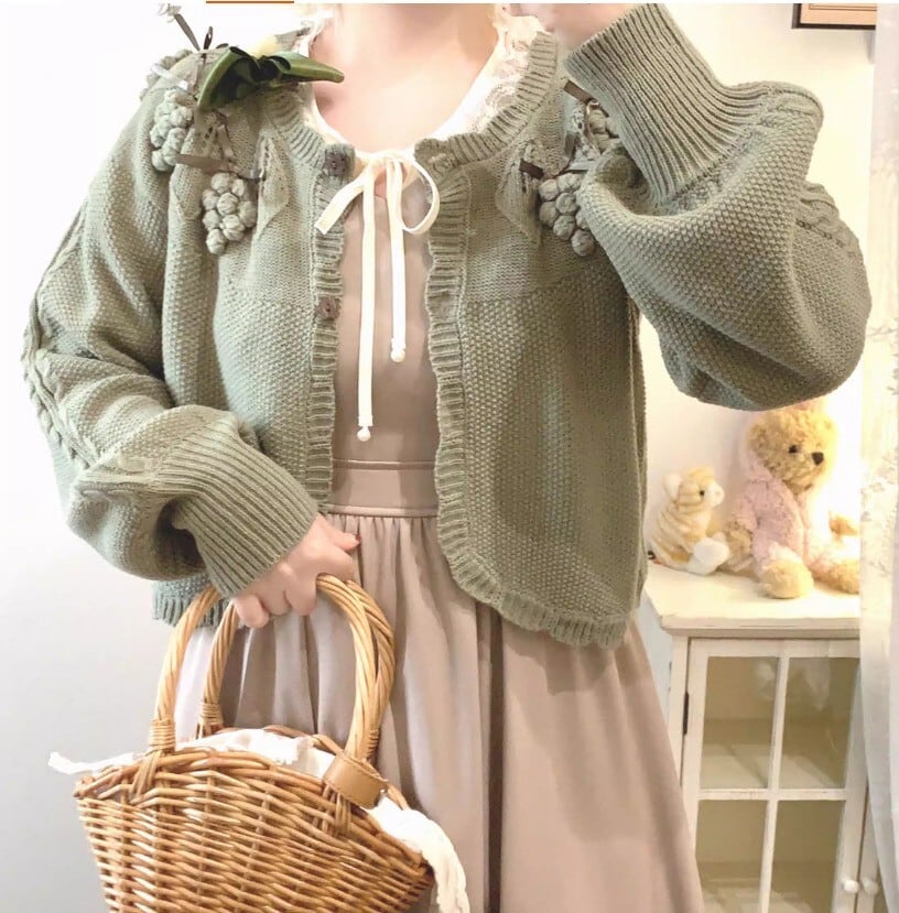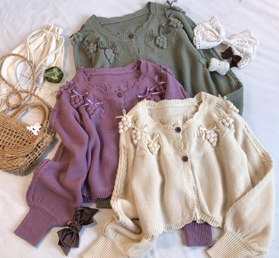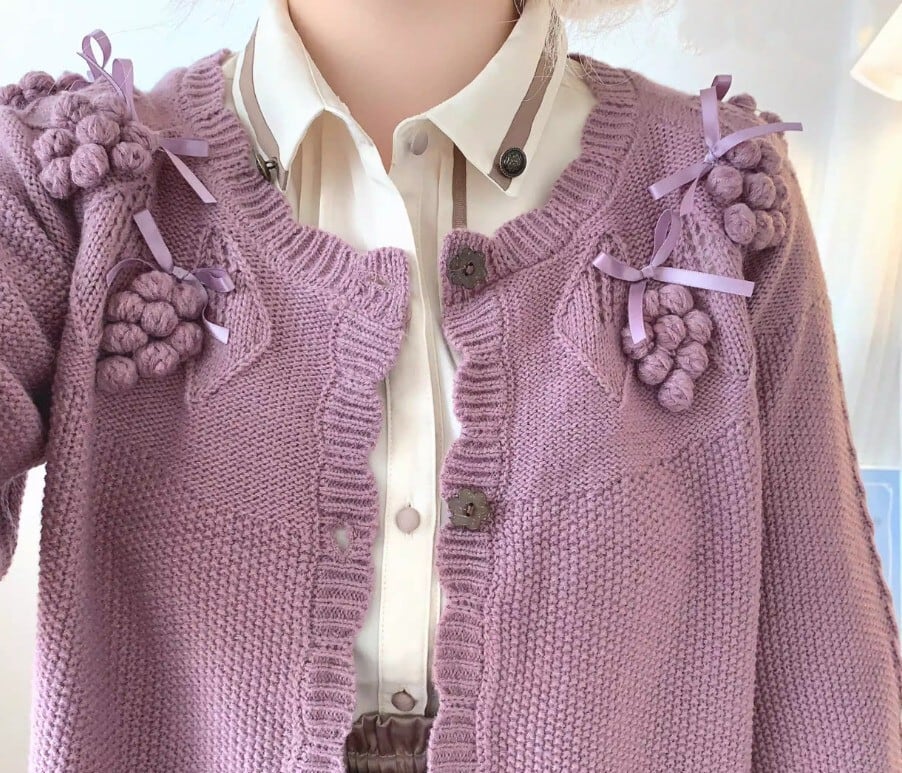 このカーディガンは、リボンとぶどうモチーフが際立つ愛らしいデザインです!