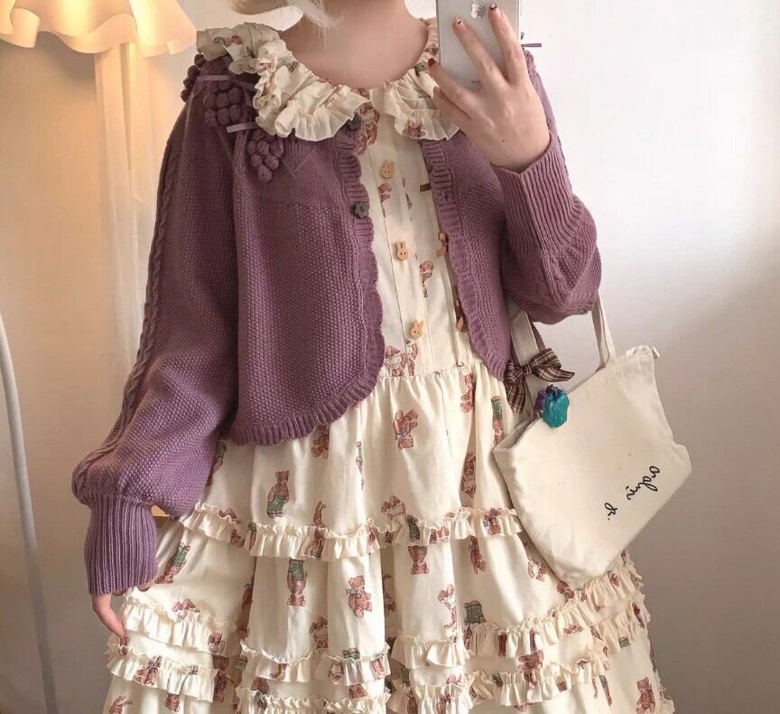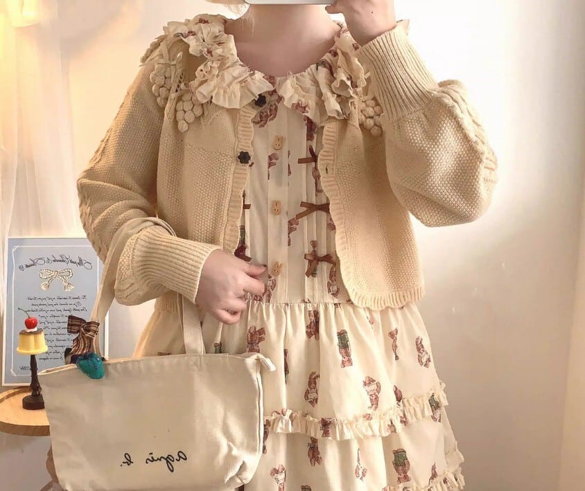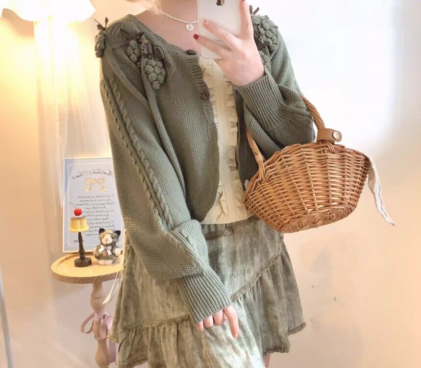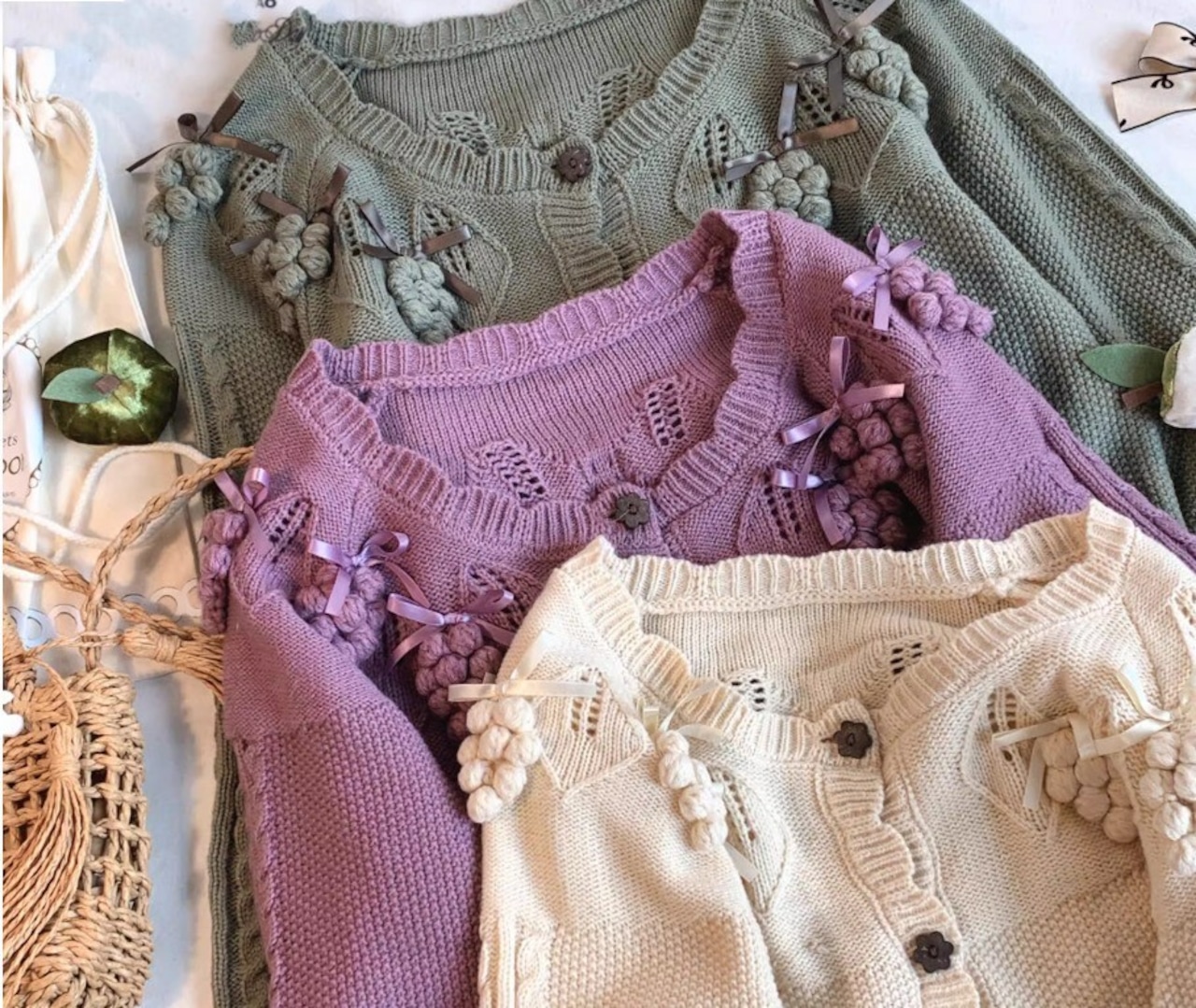 このカーディガンは、リボンとぶどうモチーフが際立つ愛らしいデザインです!