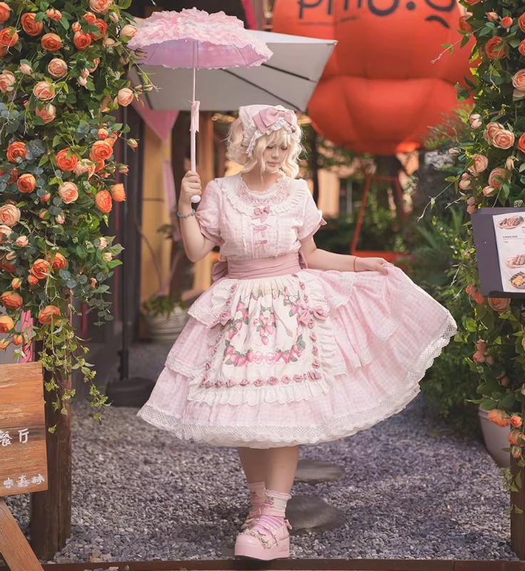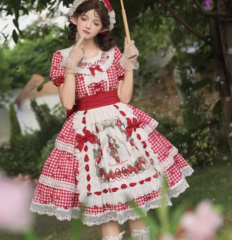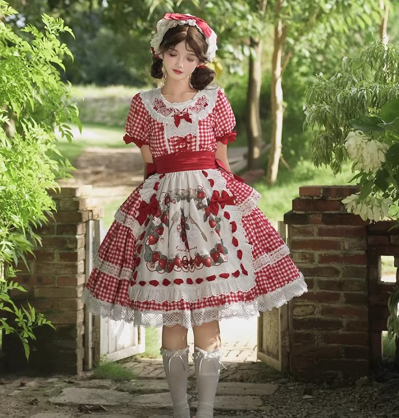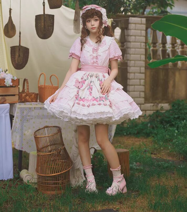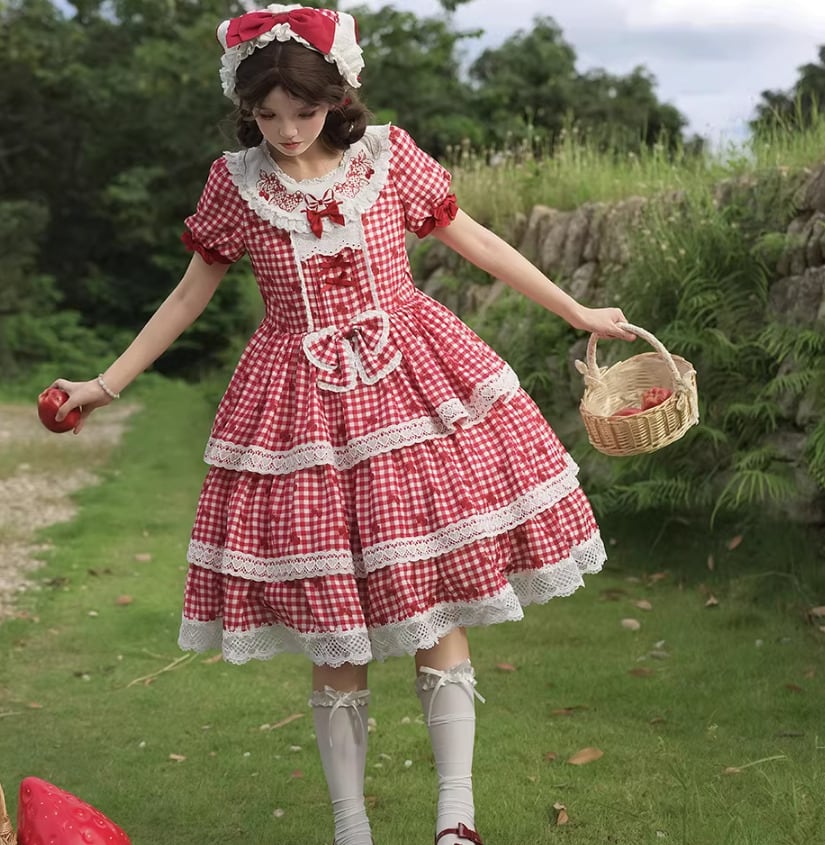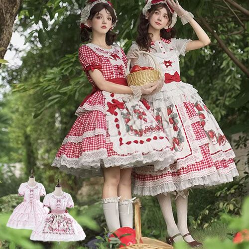 ロリータファッション ワンピース のみ 2色 ギンガムチェック 半袖 レトロ 古風 田園風 森ガール 優雅 クラシック 夏 夏物 夏コーデ 夏服 森 ピクニック 田園 お散歩