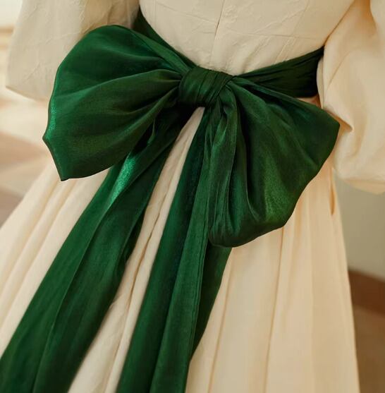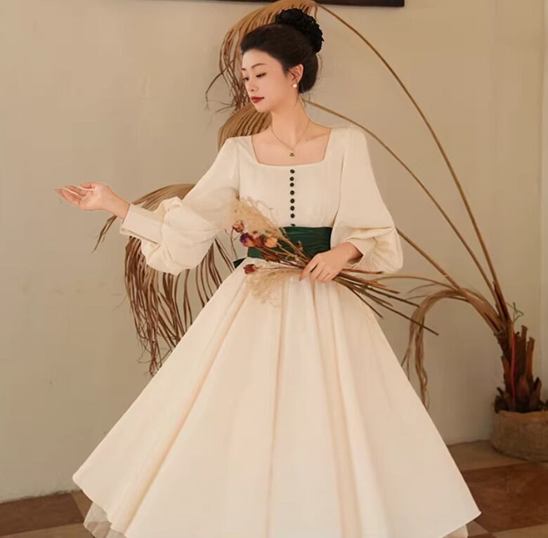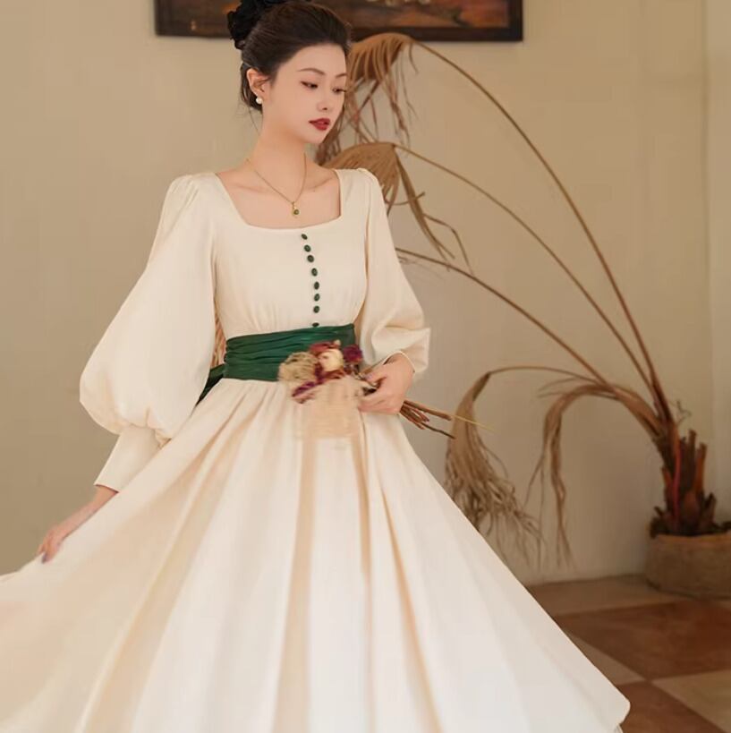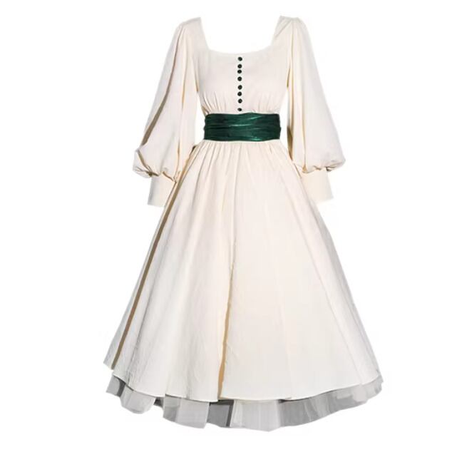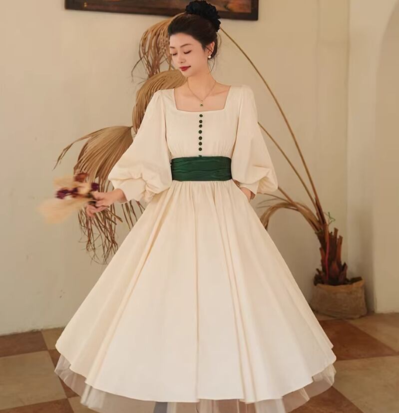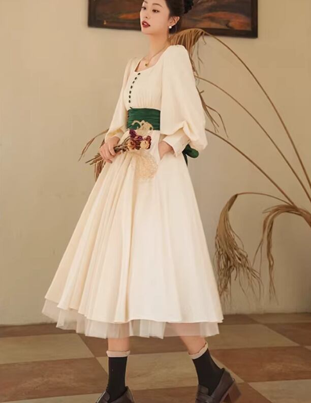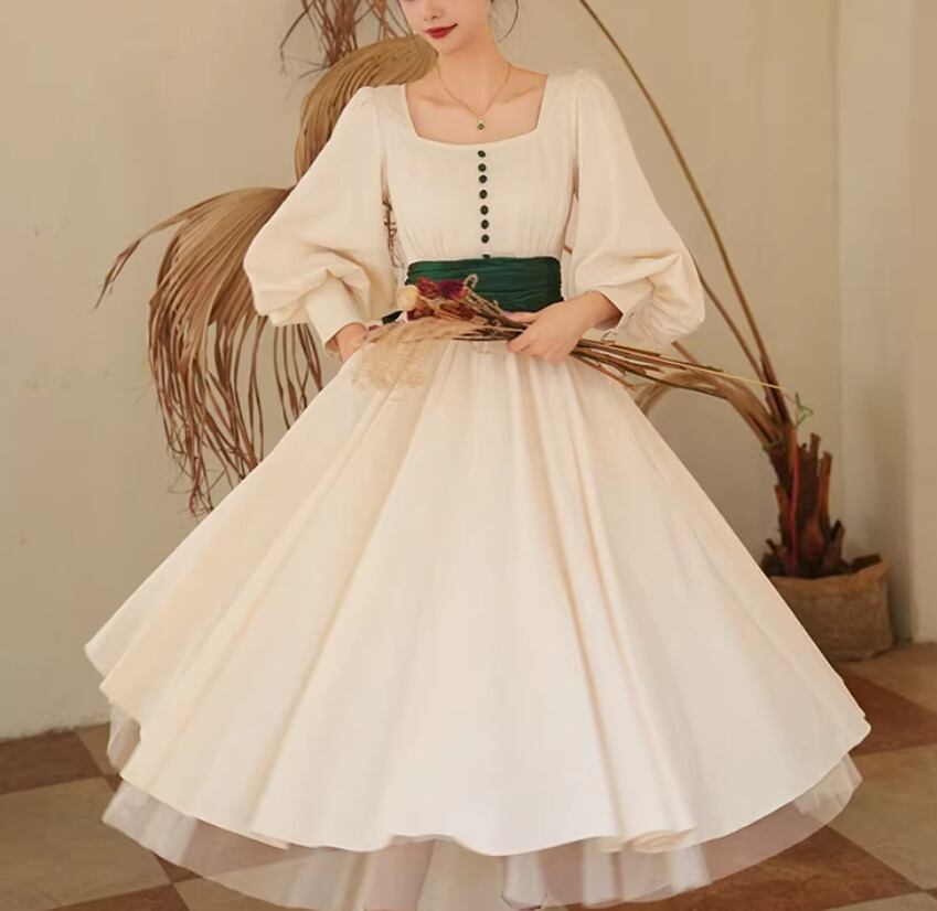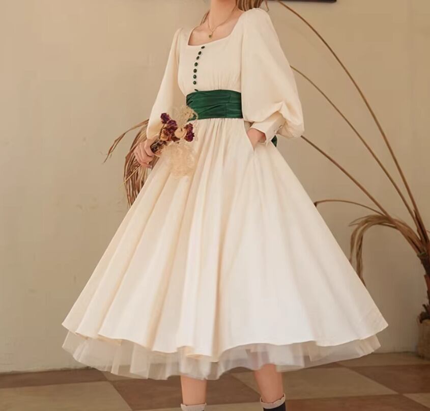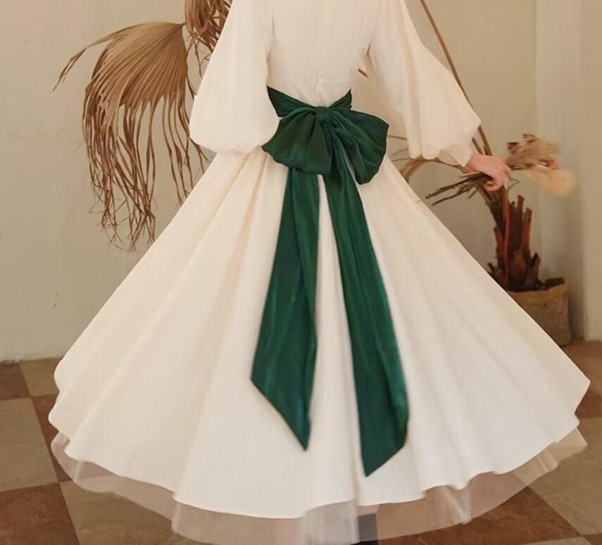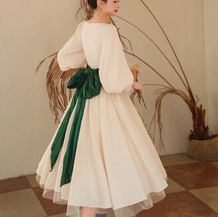 【納期1ヶ月】セミロリータ ワンピース のみ リボン ひざ下丈 ミモレ丈 長袖 レトロ 古風 アンティーク 宮廷風 大人可愛い フェミニン 春秋コーデ お茶会 デイリー デート