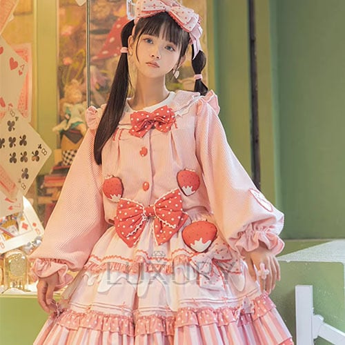 甘ロリ ジャンパースカート/サスペンダー付きスカート + ブラウス + ジャケット + カチューシャ 4点セット いちご柄 ストロベリー ミニ丈 童話風 スウィート レディース イベント