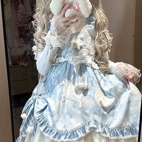 甘ロリ 姫ロリ ジャンパースカート + トップス + ケープ 3点セット 雲 くも ユニコーン ミニ丈 ショート丈 膝上 童話風 ゆめかわ ゆるふわ ラブリー メルヘン 秋冬コーデ イベント