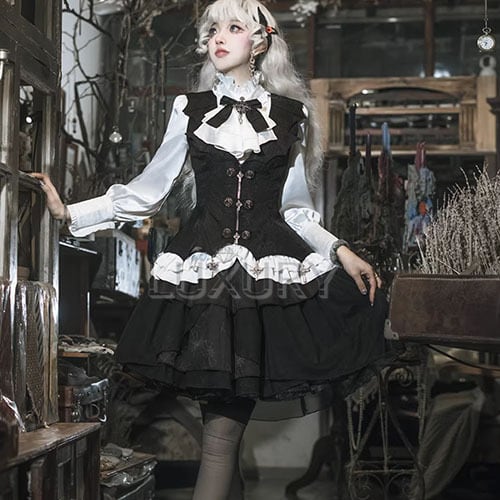 ゴスロリファッション ゴスロリ スカート + ベスト + ブラウス 3点セット ヴァンパイア 蜘蛛の巣 ショート丈 膝上 立ち襟 ハイネック 暗黒系 妖艶 レディース イベント