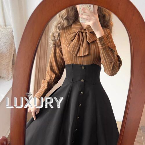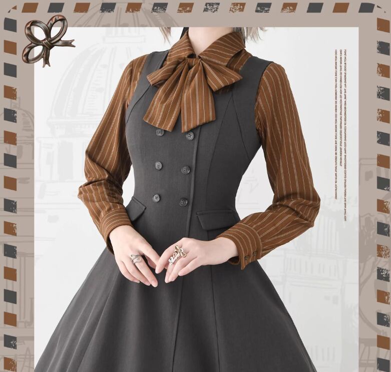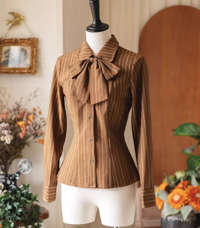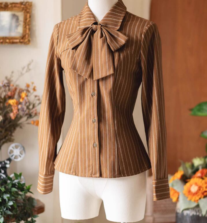 クラシカルロリータ クラロリ ブラウス のみ 2色 リボンタイ付き ストライプ 長袖 制服風 文学少女 英国スタイル 英国風 ガーリー レディース お茶会 デイリー