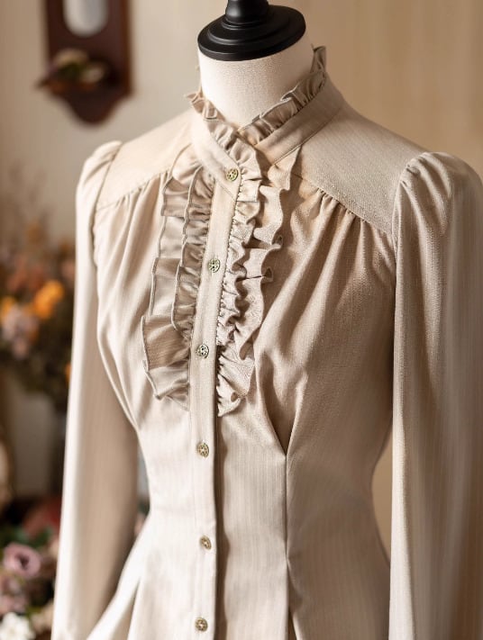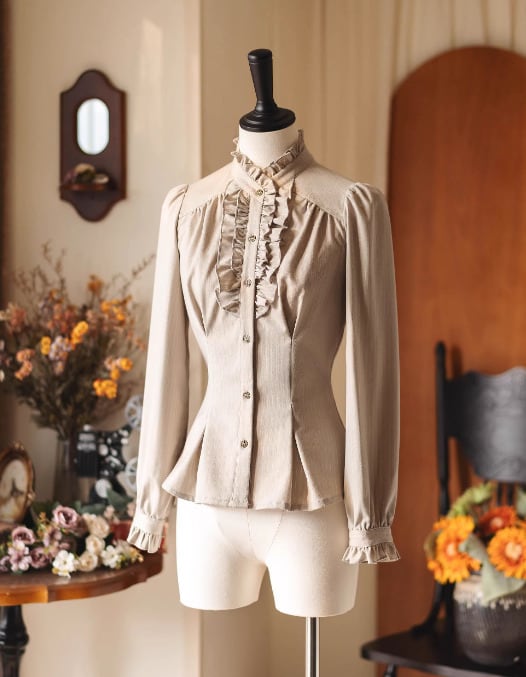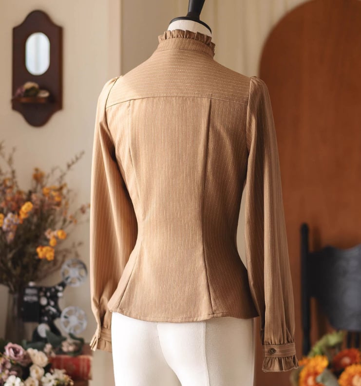 このブラウスは、長袖の立ち襟デザインとフリルが特徴で、