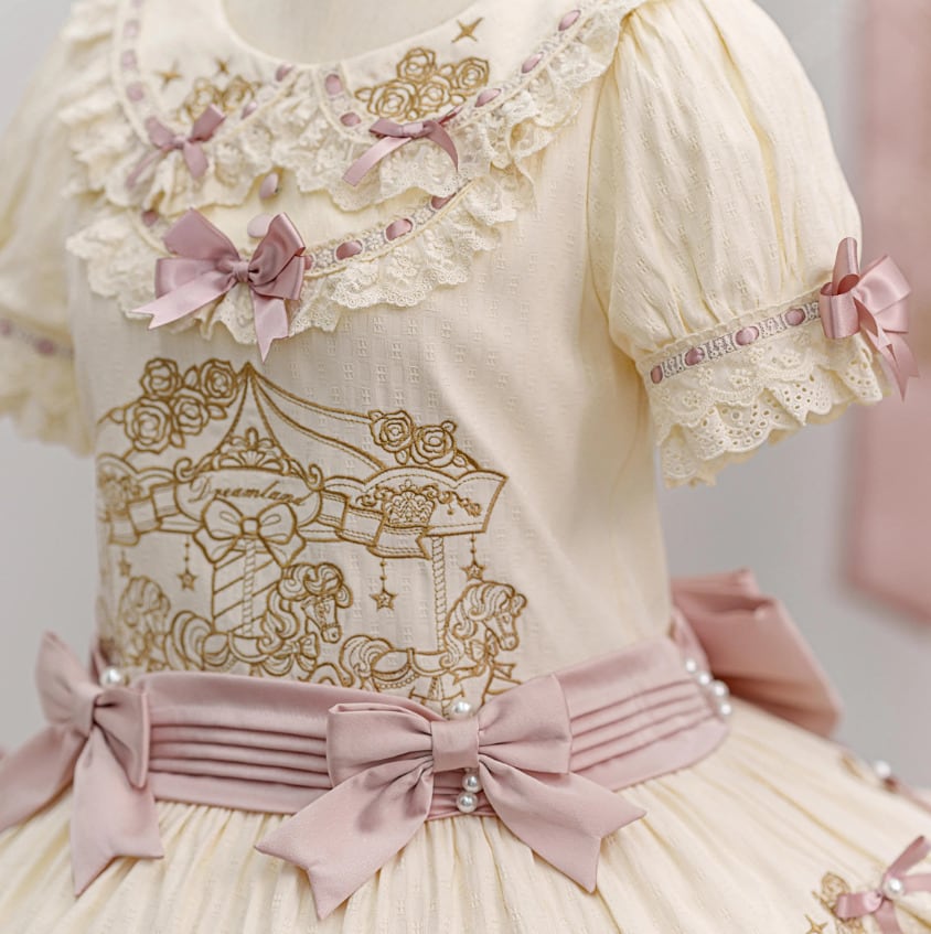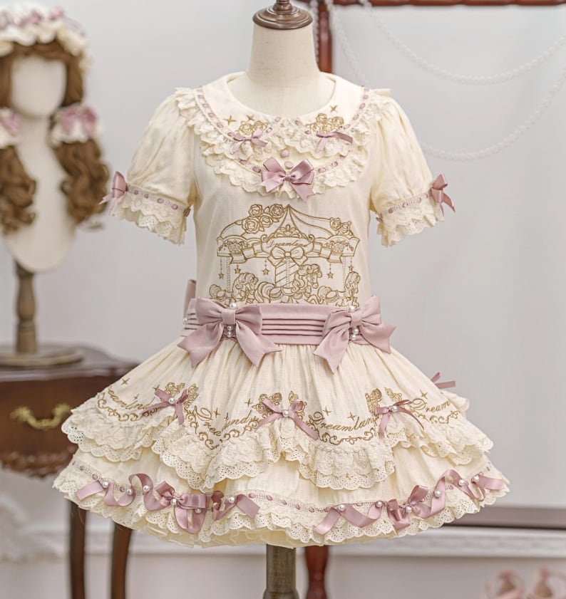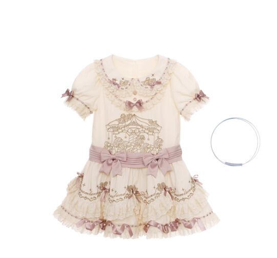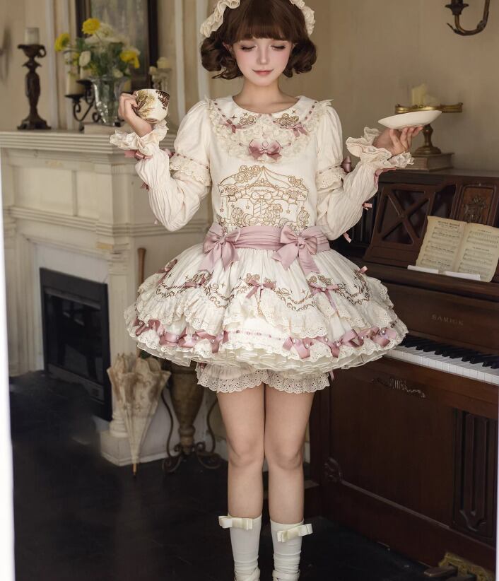 甘ロリ ワンピース + リボン + 付け袖 + ドロワーズ 4点セット フリル ミニ丈 ショート丈 膝上 半袖 お嬢様 ドール かわいい ガーリー スウィート レディースファッション イベント