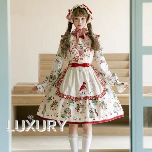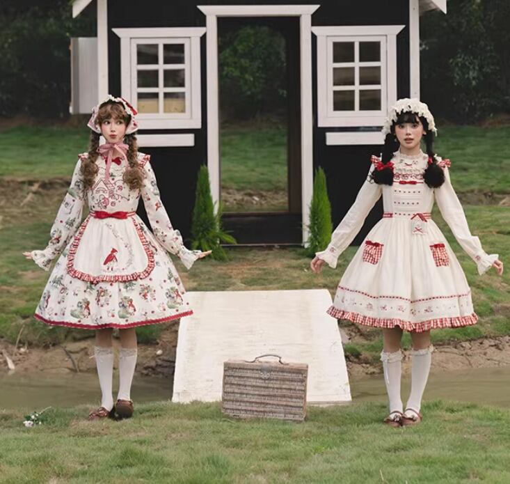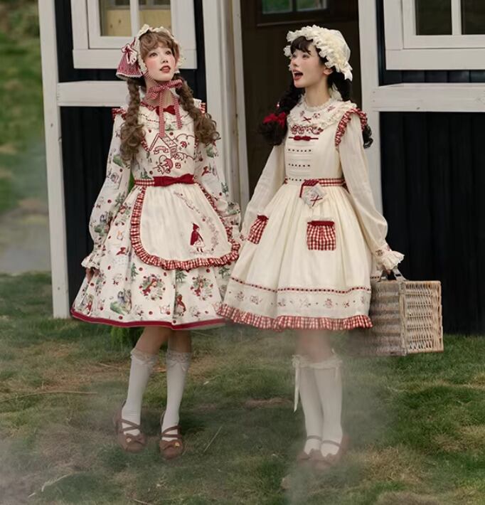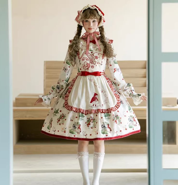 クラシカルロリータ クラロリ ワンピース のみ エプロン付き 赤ずきん 長袖 レトロ 古風 カントリー風 森ガール スウィート ガーリー レディース お茶会 撮影会