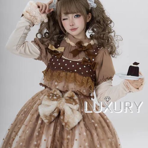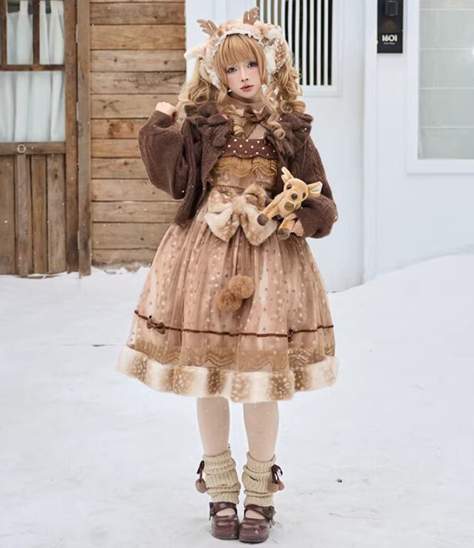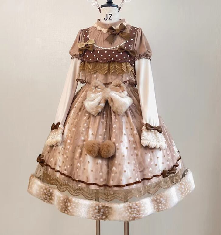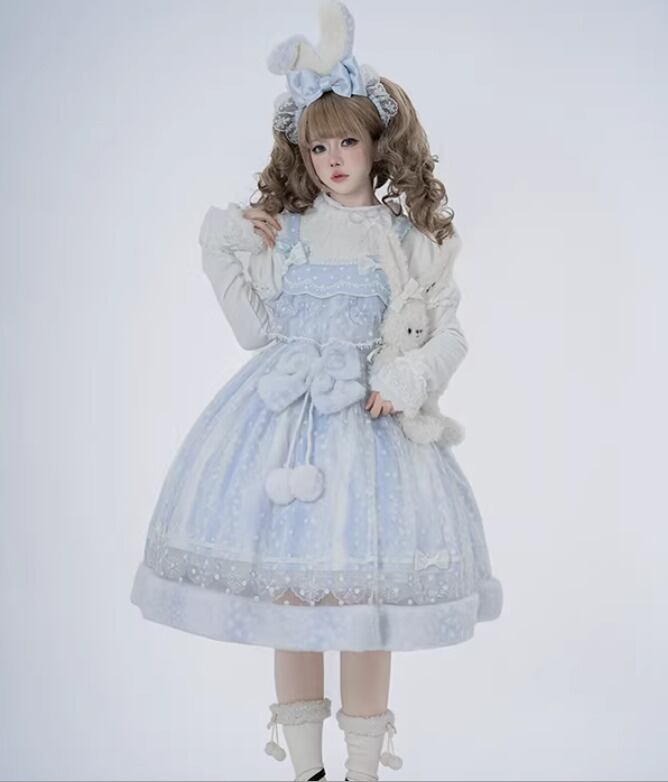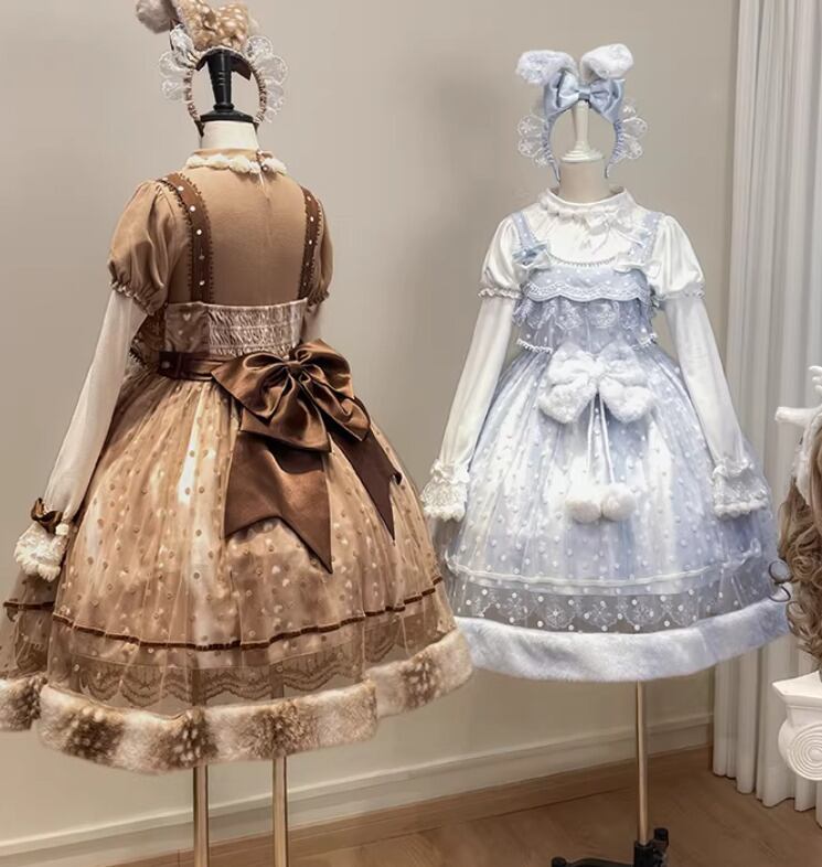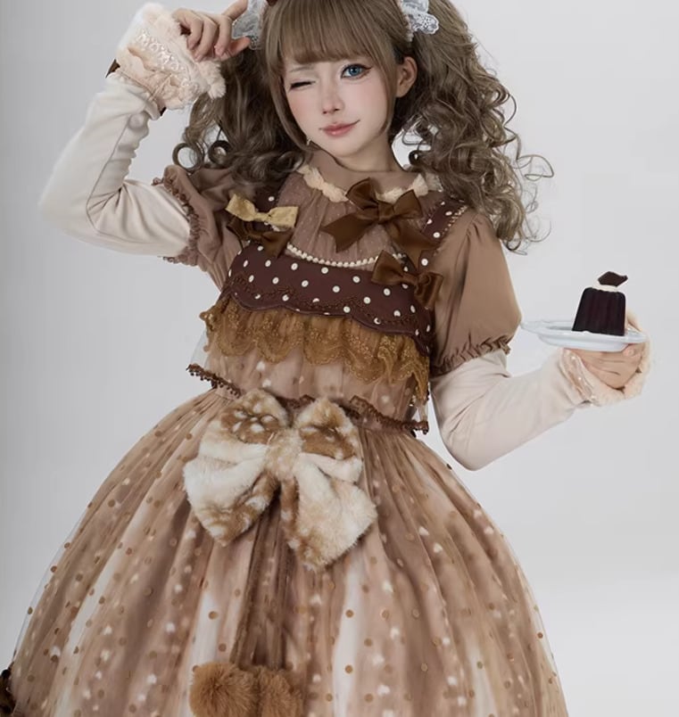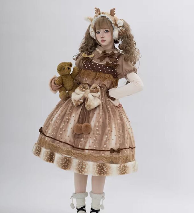 甘ロリ ジャンパースカート のみ 2色 リボン付 ドット柄 バンビ ドール 膝丈 ひざ丈 ミディアム お嬢様 ガーリー スウィート 秋冬コーデ 起毛素材 モコモコ イベント 撮影