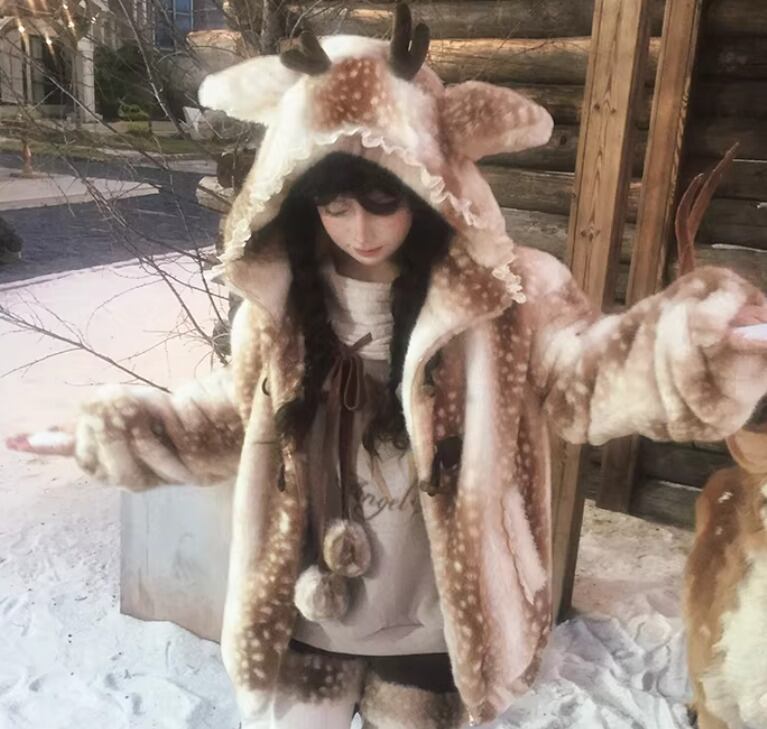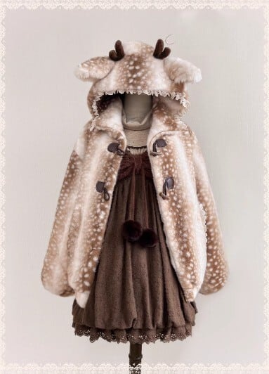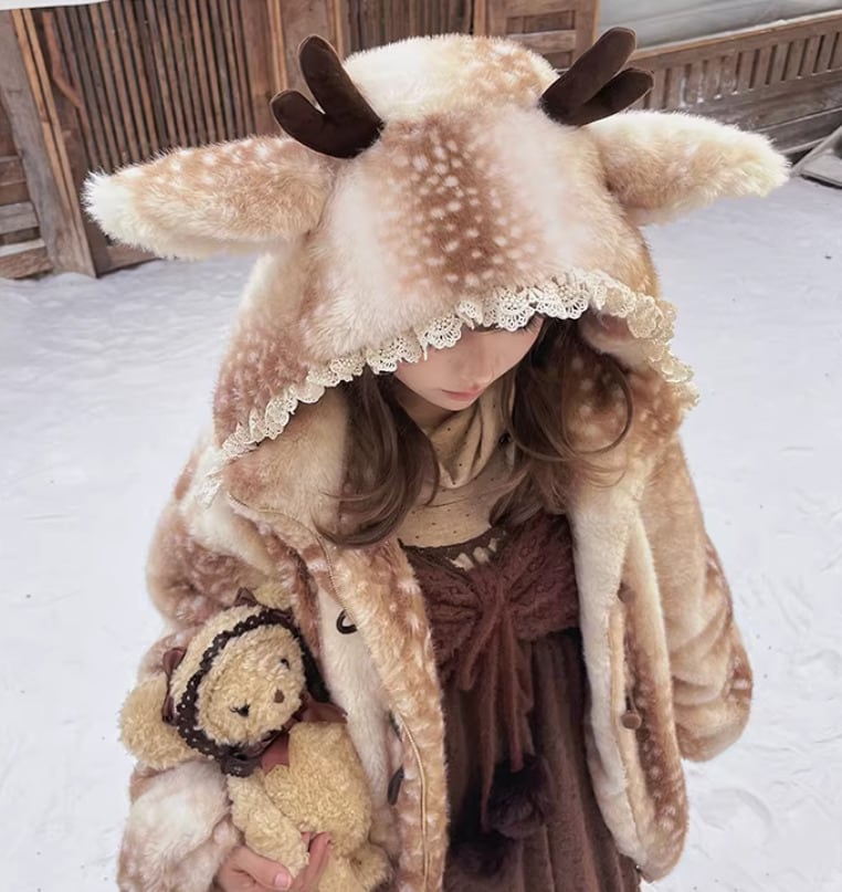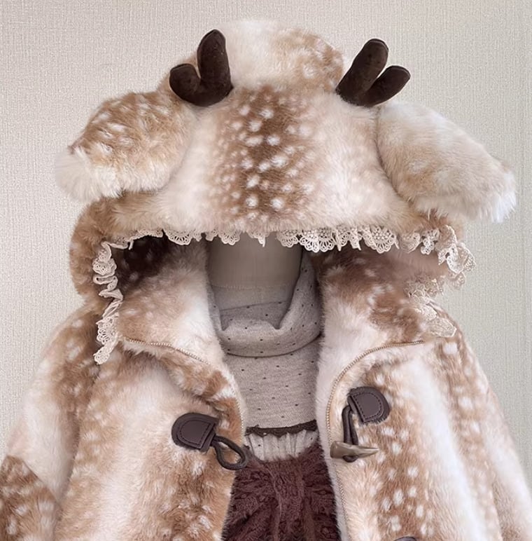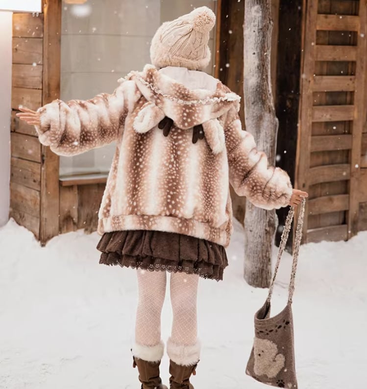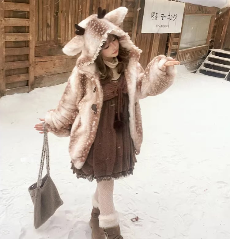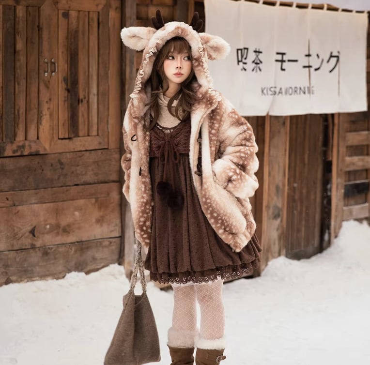 ロリータファッション 甘ロリ フード付き ダッフル風 フェイクファーコート のみ バンビ 小鹿 ゆったりめ 森ガール かわいい スウィート 秋冬コーデ イベント デイリー