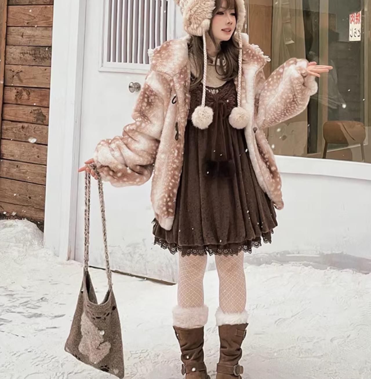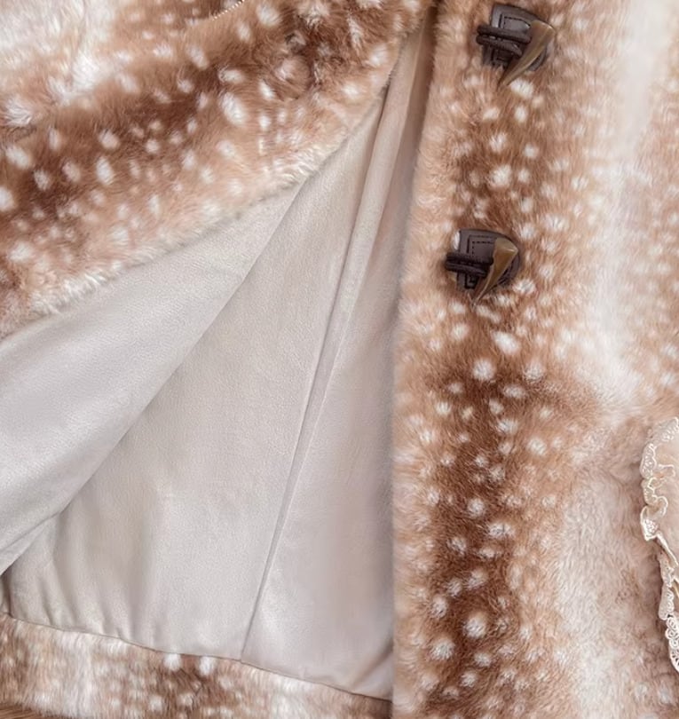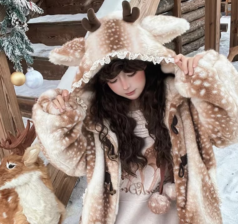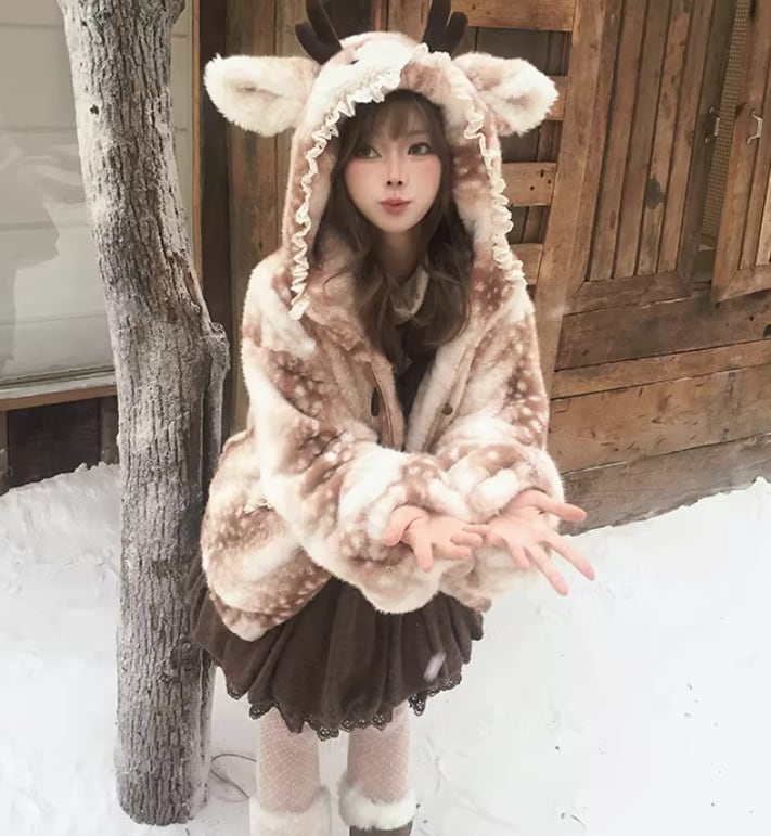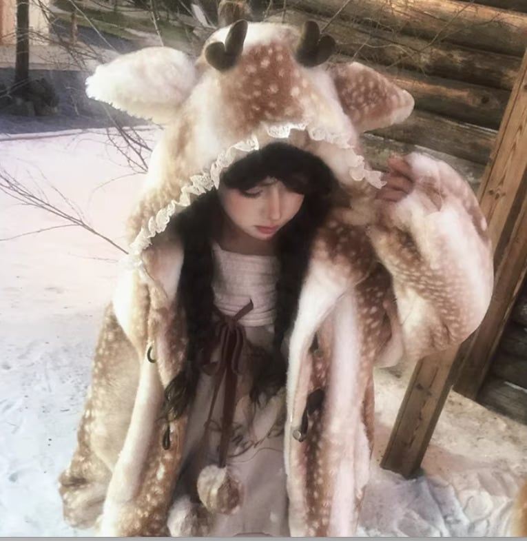 ロリータファッション 甘ロリ フード付き ダッフル風 フェイクファーコート のみ バンビ 小鹿 ゆったりめ 森ガール かわいい スウィート 秋冬コーデ イベント デイリー