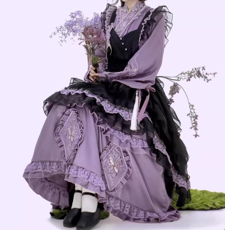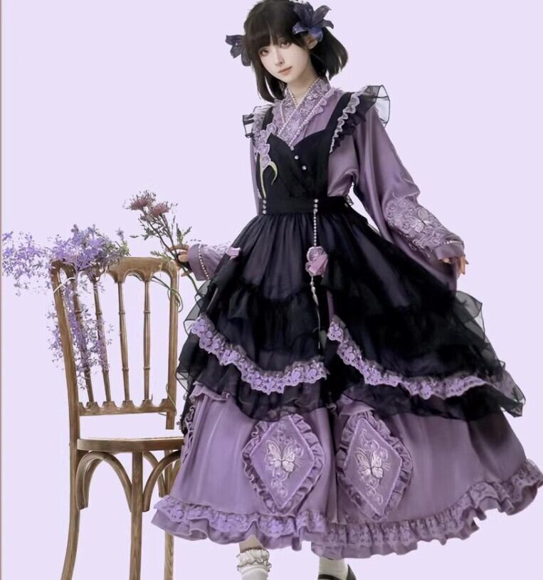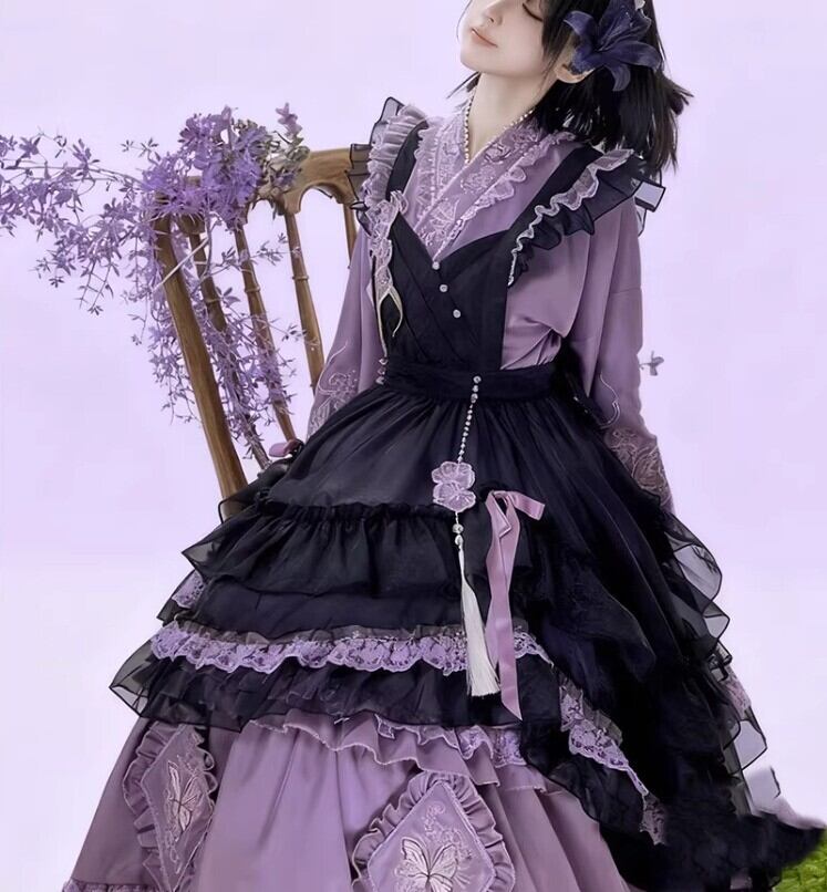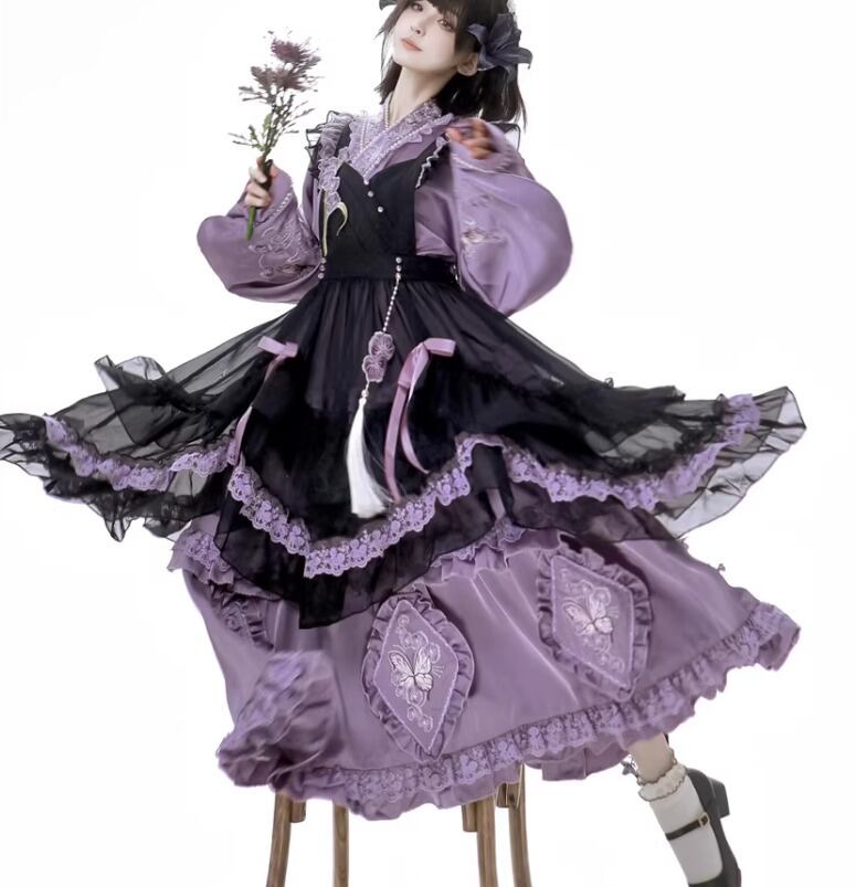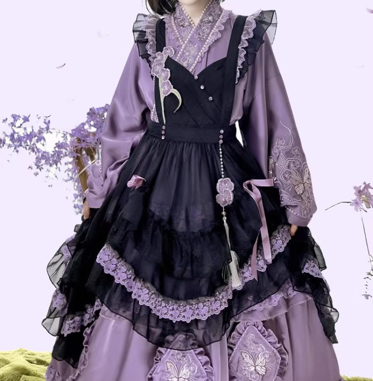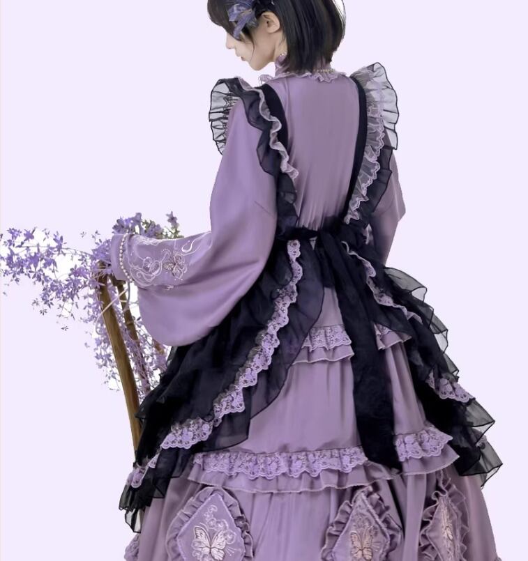 華ロリ 中華ロリ ワンピース + エプロン のみ 胡蝶蘭 デザイン ロング丈 シフォン サテン 中国風 クラシカル 優雅 エレガント レディース お茶会 撮影会